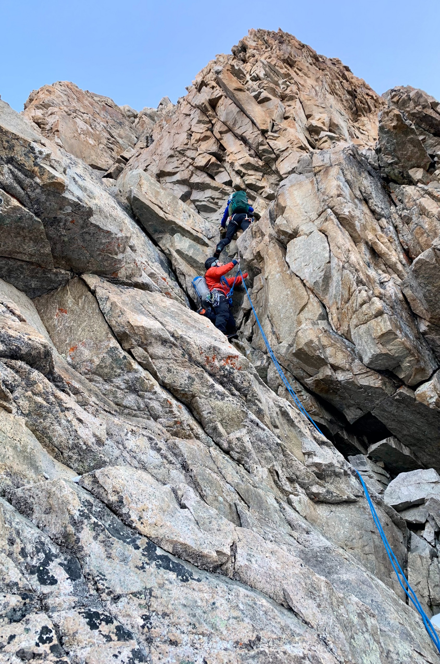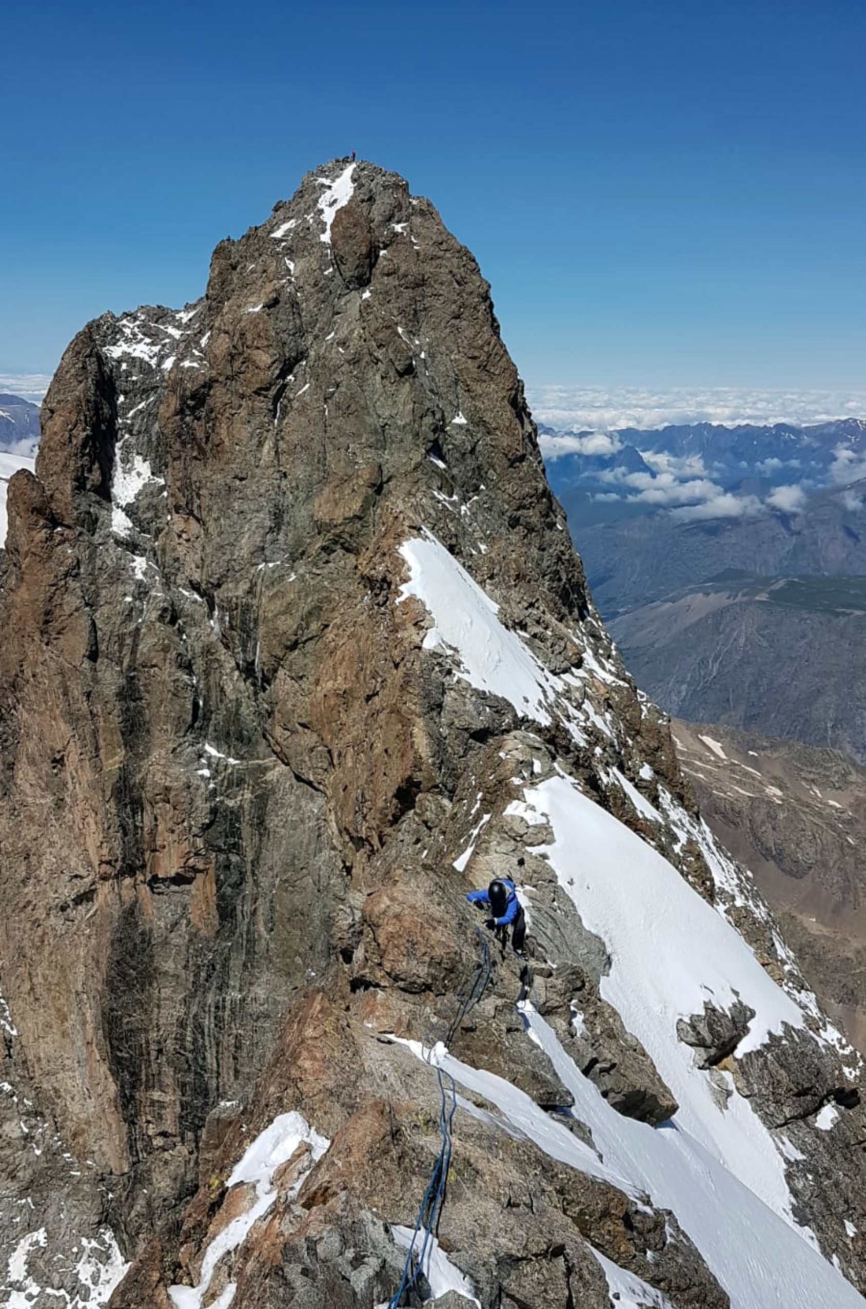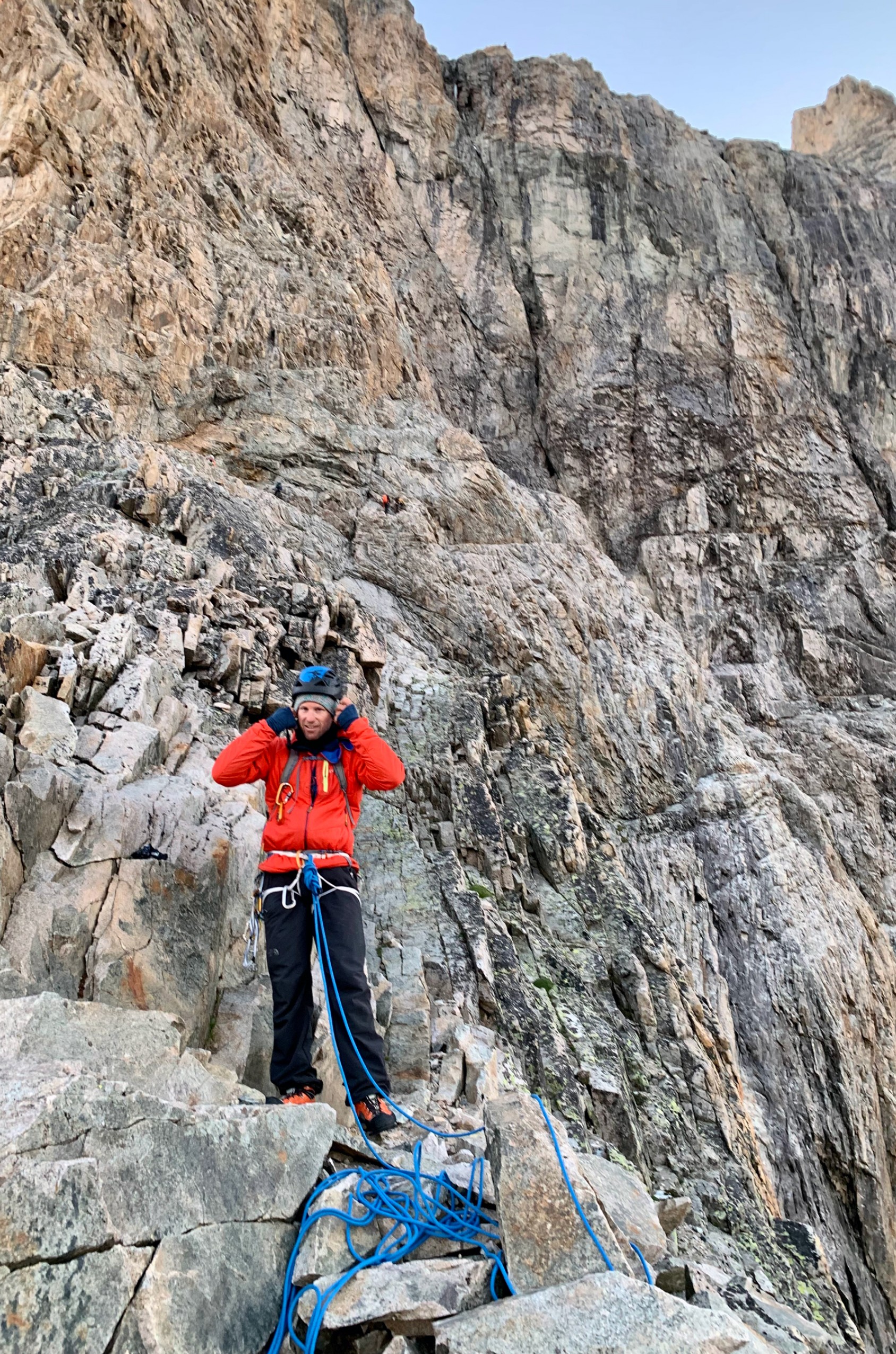 Eau, nourriture et selfies, la routine du sommet. Joie modérée, car je vois mieux ce que Mathieu veut dire par « au sommet, c’est loin d’être fini ». Trois rappels sont nécessaires pour descendre du Grand Pic sur la Brèche Zsigmondy. Lentement, très lentement, je me laisse glisser sur ce brin de corde qui me livre au vide. En plein jour, le vide est omnipotent. Si seulement il pouvait faire encore nuit, juste le temps des rappels !
