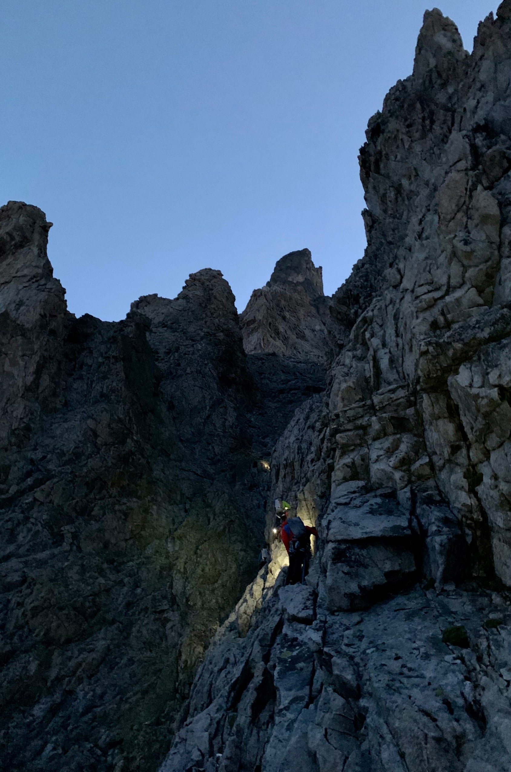 4h50. Dans le noir, le vide ne me fait pas peur. La nuit estompe la conscience de l’abîme. Dans le noir, j’oublie aussi le creux qui ronge mon estomac après un petit déjeuner sucré et frugal. Heureusement, l’escalade commence juste derrière le refuge, on n’a pas le temps de rêvasser à des oeufs brouillés à la truffe ou des saucissons imaginaires.