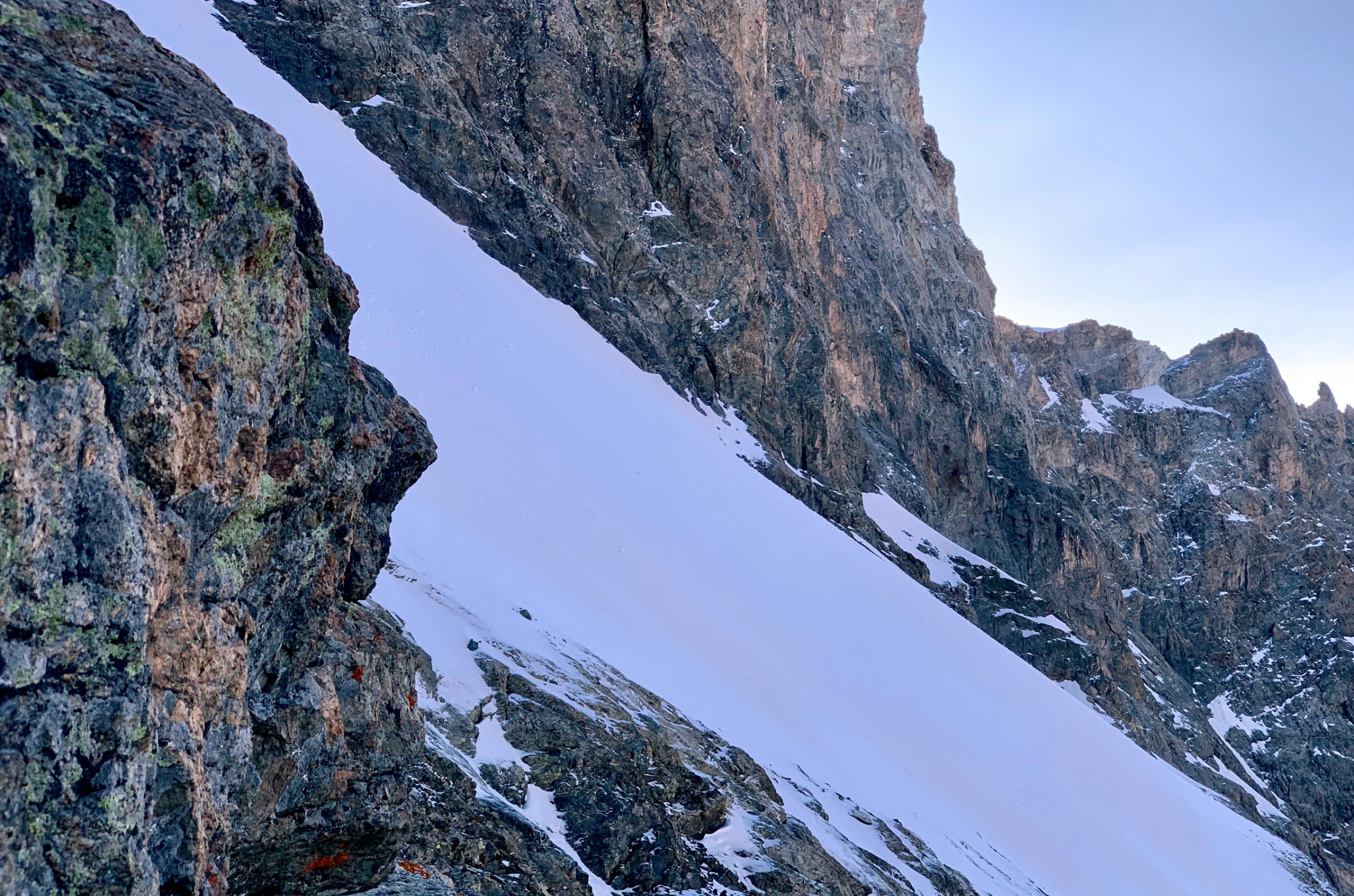 Mathieu me descend en moulinette dans une autre brèche, celle qui précède le Doigt de Dieu. Appelé aussi le Pic Central de la Meije, ce sommet sera les derniers mètres de dénivelé positif de notre traversée — je pourrais presque m’en passer, mais il n’y a pas de voie alternative. Ici, à 3973 m, nouveau dilemme mystique : pourquoi l’appelle-t-on Doigt de Dieu, mise à part sa forme de relique surhumaine ? Son orientation de bas en haut et non de haut en bas est une vraie énigme. Cela veut dire que soit (1) il n’appartient pas à Dieu, céleste par nature, soit (2) Dieu même siège dans cette montagne, de façon animiste. Après 8h d’effort et un certain manque d’oxygène, je conclus que ce doigt doit appartenir à une déesse chthonienne, maîtresse du granite et du gneiss, en colère contre le cosmos pour ses foudres et inconstances. Appelons le « le Doigt de la Déesse », ça me paraît plus plausible.