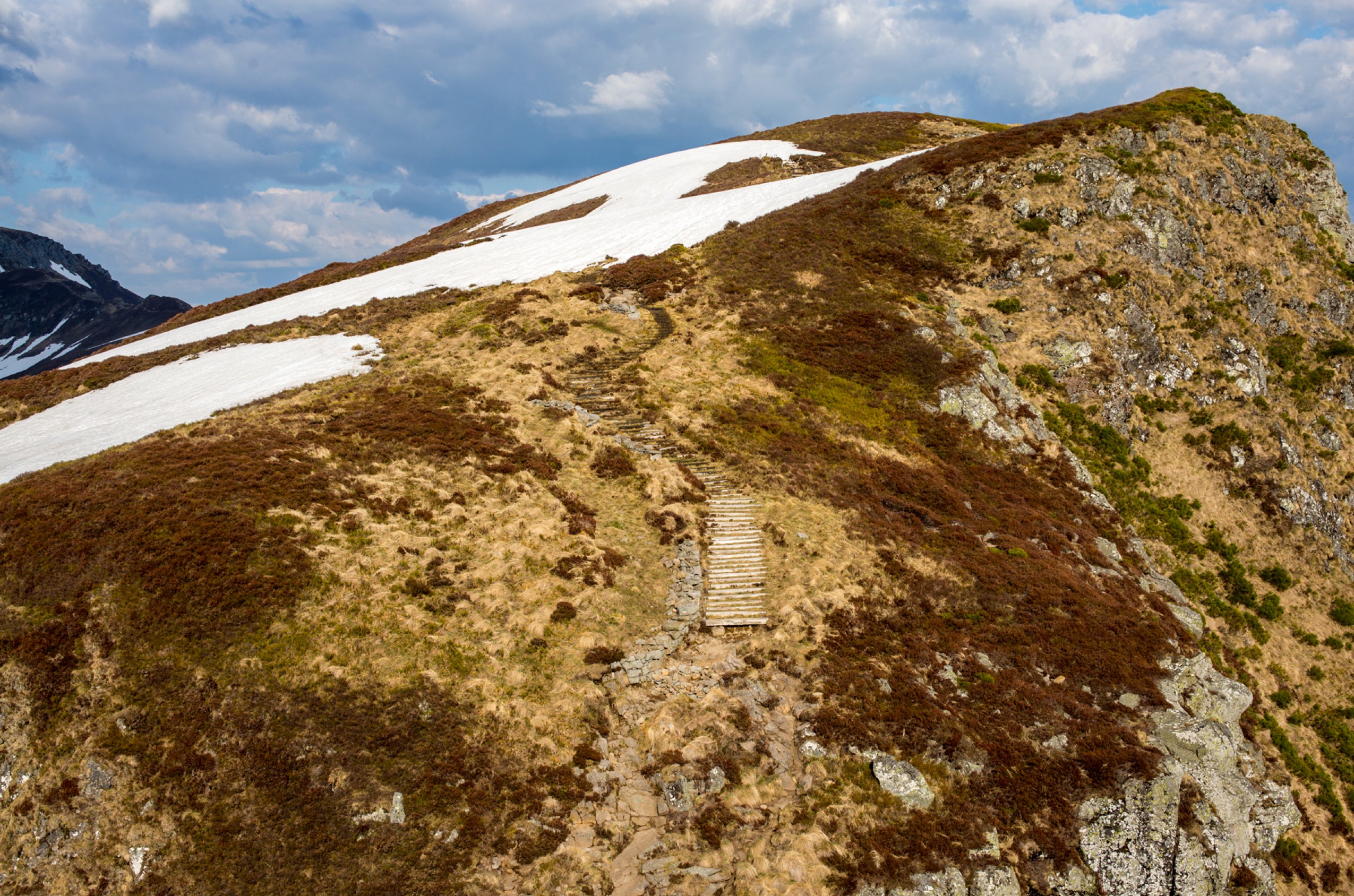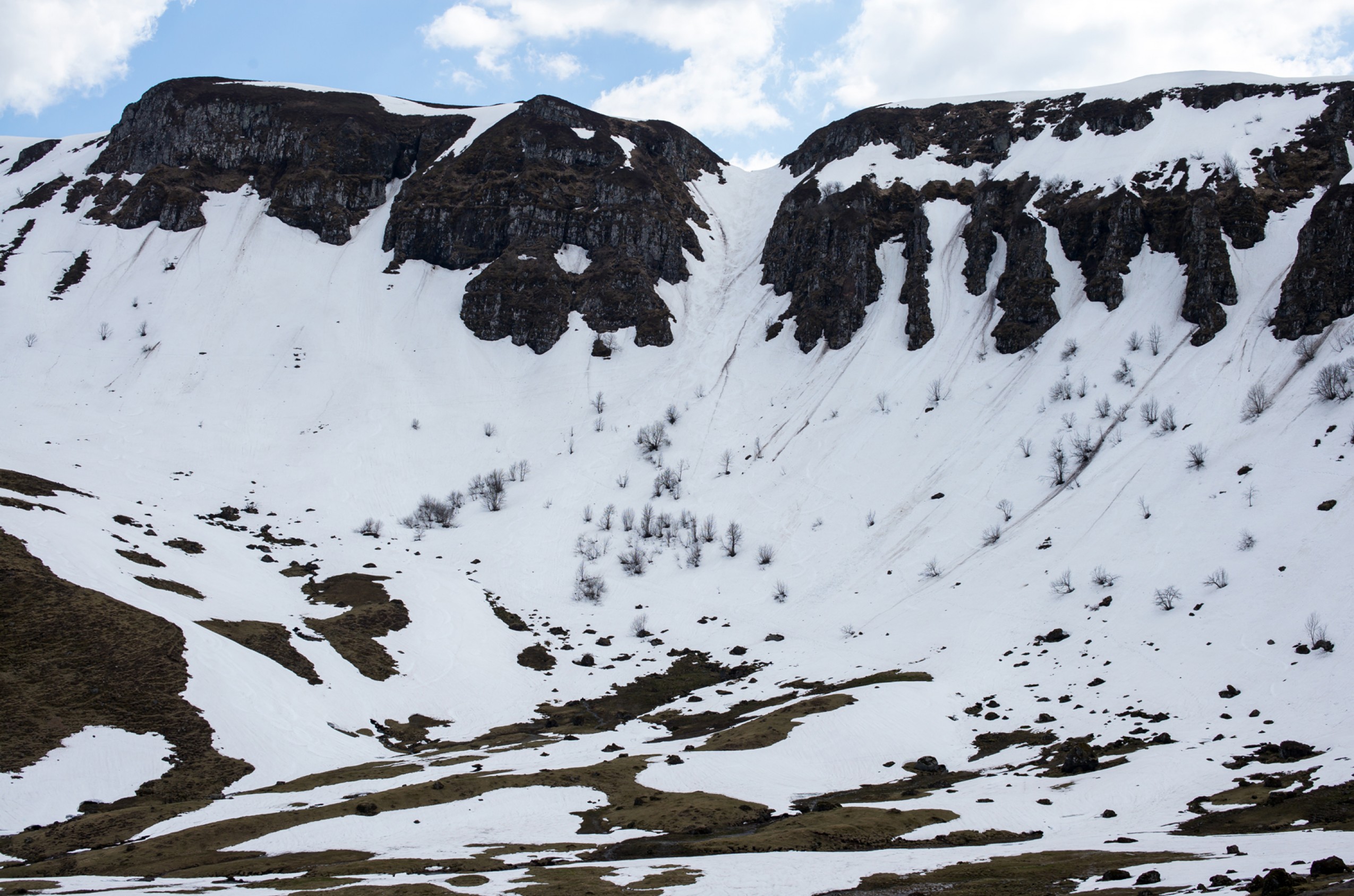 Même si 1806 m est un peu moins impressionnant que 4806 m, il ne faut pas sous-estimer l’Auvergne, ses monts, ses volcans, ses névés et ses brèches… En tant qu’entraînement pour le Mont Blanc, nous avons grimpé cet avril deux sommets des monts du Cantal (Massif Central), Puy Mary (1783 m) et Puy de Peyre-Arse (1806 m).