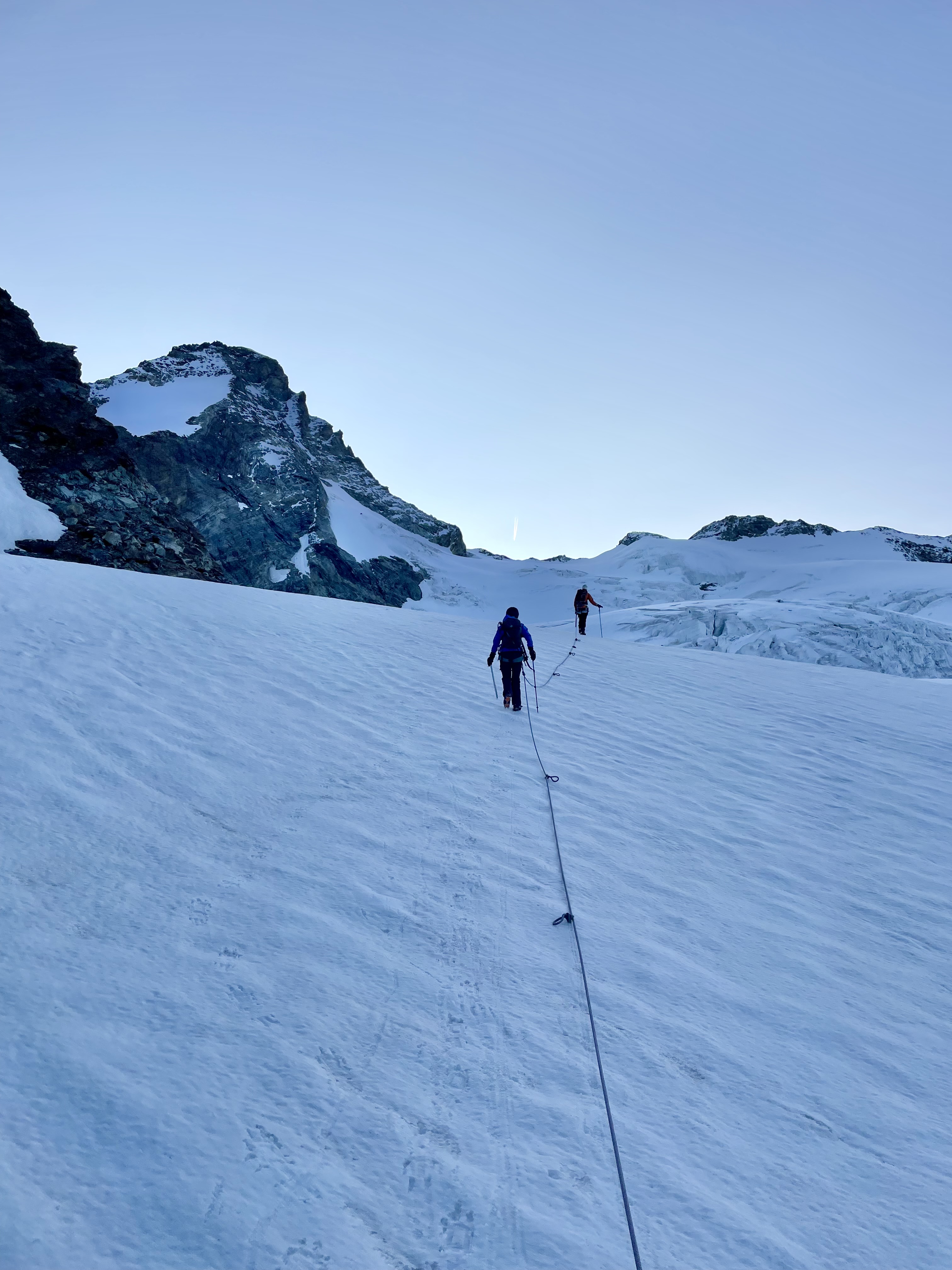 Bonne fenêtre météo les 12–13 septembre. Nous sommes trois : Lancelot, Julien et moi. Trois niveaux différents d’expérience, de motivation et de forme physique. Lancelot, l’aguerri ; Julien, dont la motivation est la plus grande force en ce moment ; et moi, plutôt en forme, encore sous l’effet de la récente sortie au Weissmies et au Lagginhorn.