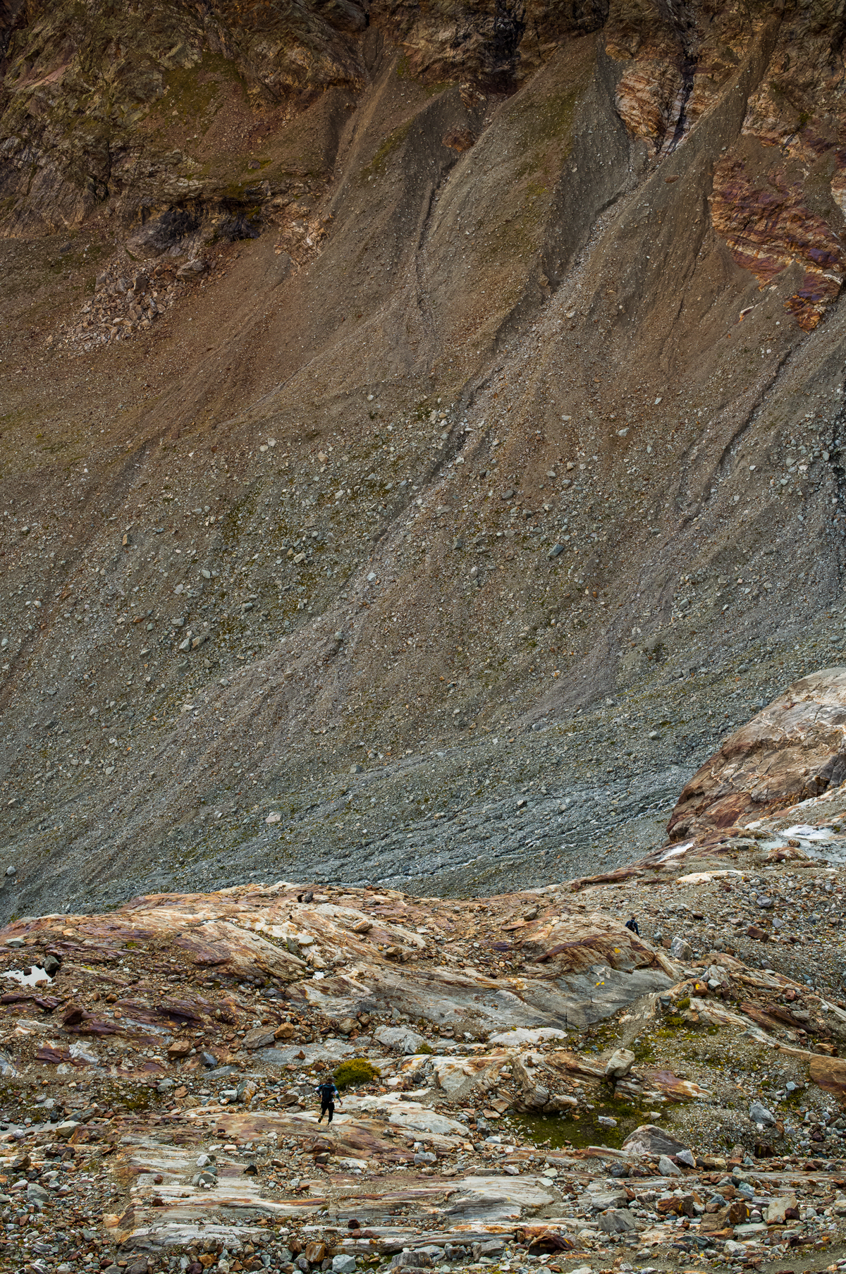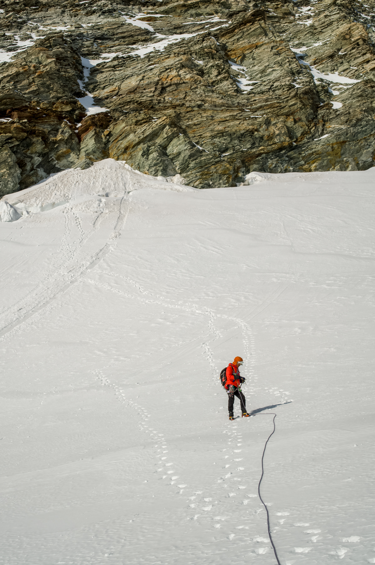 Le 11 septembre, nous chargeons les sacs. Quinze kilos de vivres et de matériel – plus d’un tiers de mon poids – qui se démultiplient à chaque pas. Nous longeons d’abord le lac de Places Moulin (5 km) jusqu’au hameau Prarayer, puis le torrent de Buthier de Valpelline (6 km), et enfin les dalles polies du glacier bas de Tsa de Tsan. Le refuge Aosta (2 788 m) est déjà fermé, mais la partie d’hiver est ouverte, ce qui nous évite d’emporter les sacs de couchage. Une autre cordée arrive un peu après nous, une alpiniste japonaise accompagnée de son guide suisse. Les edelweiss poussent comme des chardons autour du refuge. Je trouve ça beau. Le soir, nous préparons nos soupes, risottos et purées avec l’eau du torrent. Dîner copieux, nuit tranquille, pas de ronfleurs. La météo nous incite à tenter le sommet dès le lendemain, sans attendre.