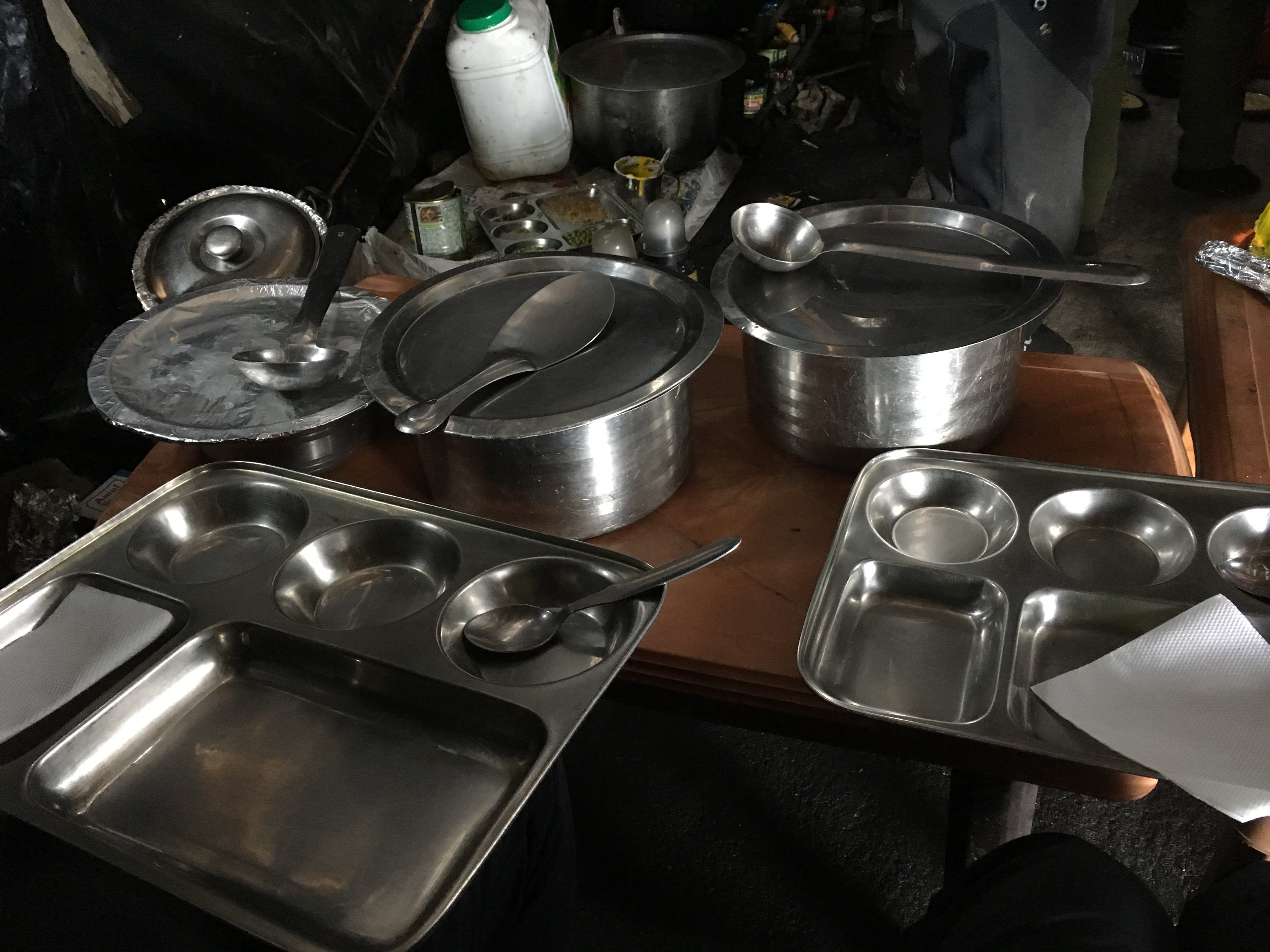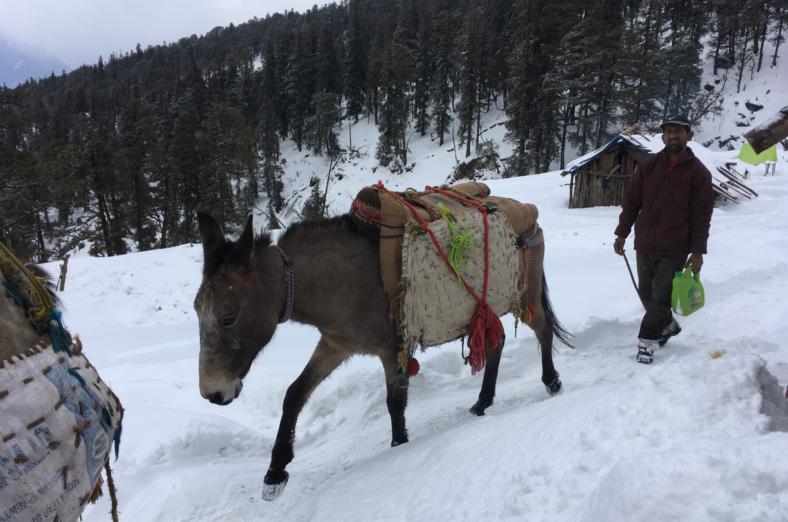 À l'aube, on prend le petit déjeuner avant que Pankaj charge les mules de nos bagages. On n'a pas de gros bagages et l’on essaie de porter nous-mêmes le maximum, mais les mules ont plein d'autres choses à transporter, des bouteilles de gaz et des sacs rugueux de jute remplis des vivres pour les cuisines des camps de bases. Les bêtes sont assez adroites, même sur les sentiers plus raides, menés de derrière par les "ha!" de leurs maitres Sherpas. Après quelques heures (quatre heures ? cinq heures ? je ne pourrais pas dire) de marche et de nombreuses pauses chaï, nous arrivons à Jadu Ka Talab (2773 m), le lieu où nous allions camper pour la nuit, pour la première fois dans des tentes sur la neige. Le paysage commence à s'ouvrir et la neige couvre les alentours, les arbres. Plusieurs compagnies de guides ont implanté des clusters de tentes autour d'une tente maitresse : la cuisine. La nourriture est fantastique et nous attendons avec une impatience pavlovienne chaque repas. On ne s'imaginait pas que la nourriture faite dans ces conditions-là pourrait être si délicieuse et bonne – on n'a pas eu le moindre problème digestif pendant le trek.