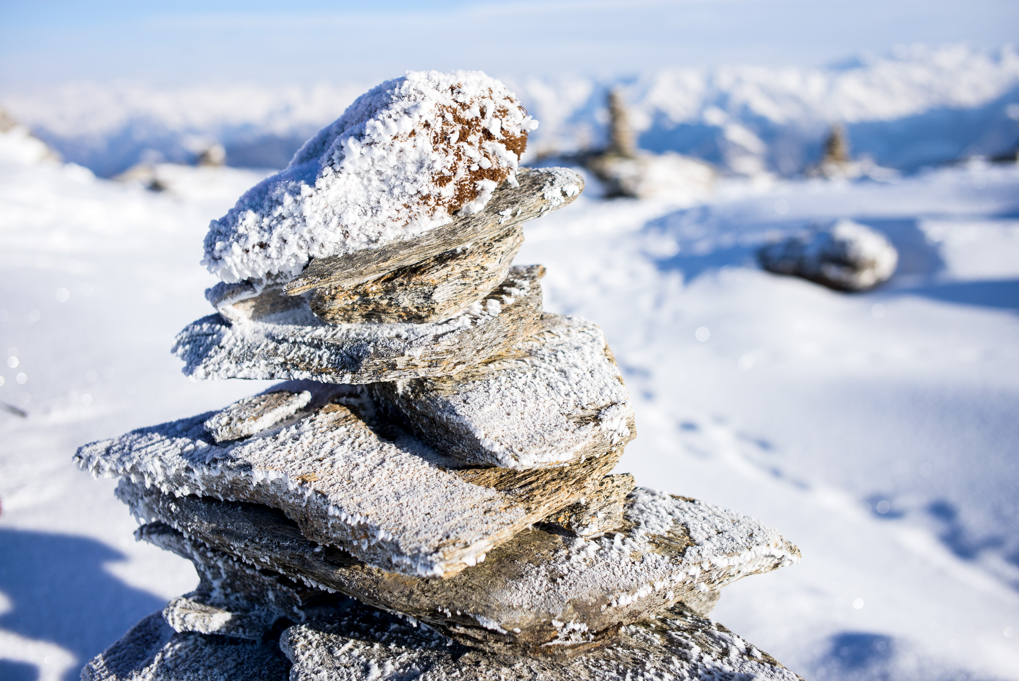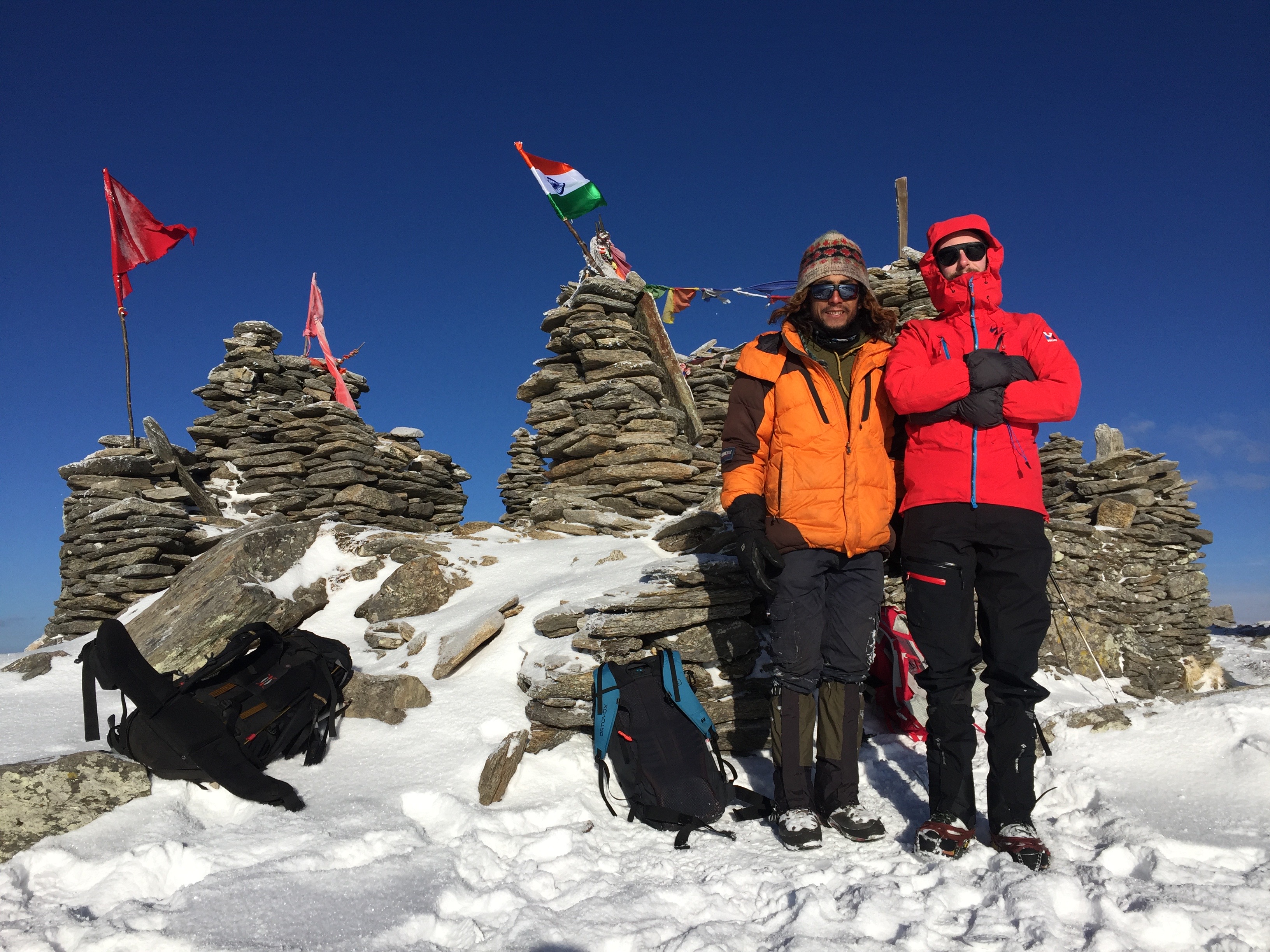 C'est beau au sommet. Bien qu'à moins de 4000 m, le froid et le vent hivernal subliment le Kedar Kantha, le rendent majestueux et digne de ses voisins plus hauts. Nombreux cairns couverts de neige et de givre marquent le sommet.