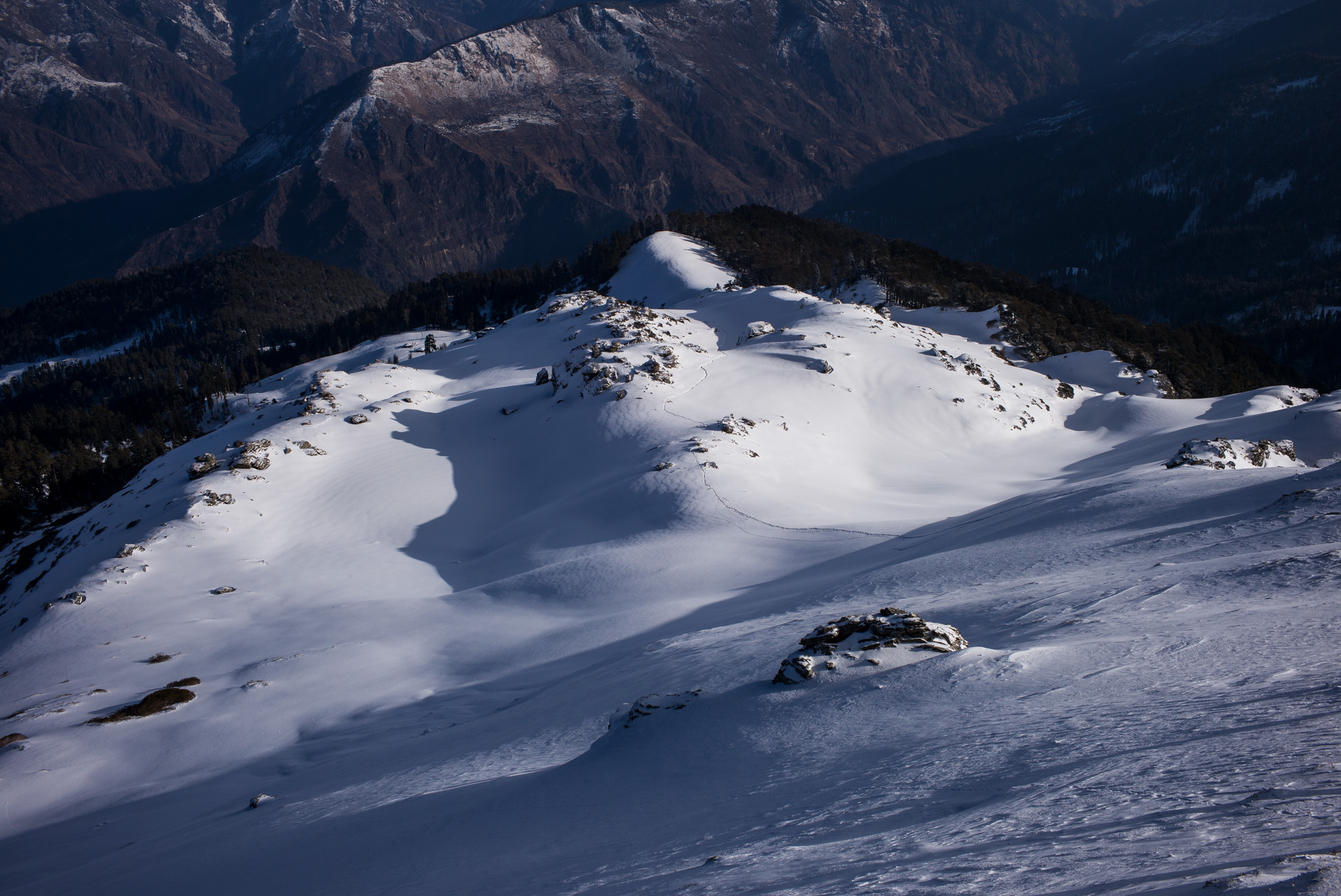 Nous faisons la dernière montée vers le sommet, bouche bée – et ce n'est pas à cause de l'effort. C'est la vue stupéfiante d'une chaine compacte de sommets de 6000 ou 7000 m au loin. Le côté gauche nous apporte non seulement le soleil et le vent, mais aussi cette vue vers une pléthore de sommets dont Pankaj nous dit les noms, mais dont on a retenu, songeurs et émerveillés, que Gangotri. C'est là où l’on aurait dû aller, mais c'est sans doute un lieu où nous allons revenir, si jamais nos pas nous porteront de nouveau en Inde.