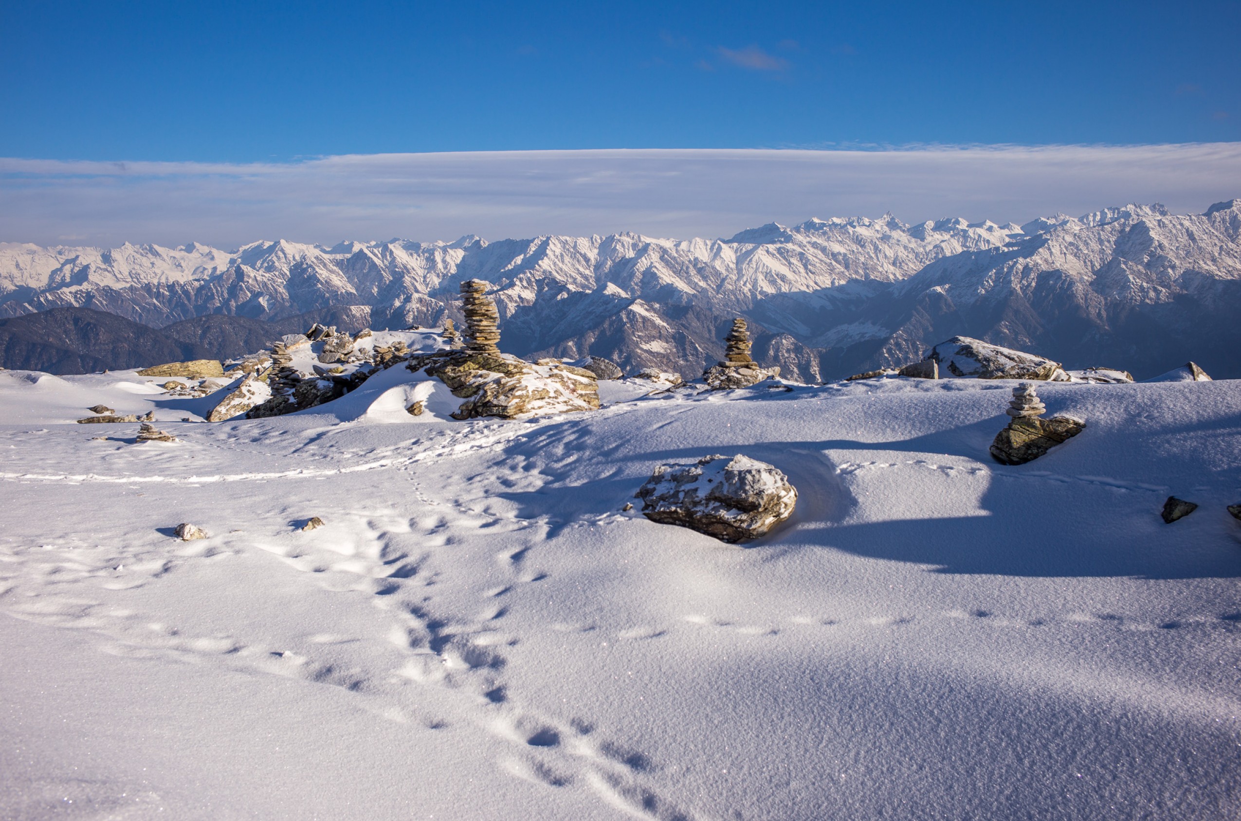 Généralement, qui dit "Himalaya" dit tout de suite Népal, Pakistan ou Chine. On y pense pas spontanément, mais le nord de l'Inde est le berceau d'un nombre impressionnant de sommets comme le Kangchenjunga (8586 m, le troisième sommet au monde), le Nanda Devi (7816 m), le Kamet (7756 m) et plein d'autres dans les états de Jammu et Kashmir, Himachal Pradesh, Uttarakhand ou Sikkim. Pour nous, c'est l'état d'Uttarakhand qui nous a attiré l'attention, où se trouve la source de la rivière sacrée des hindous, le Gange. Sans grande surprise, nous avons découvert qu'en plein hiver les parcs nationaux sont fermés à cause des conditions météorologiques. Pas de possibilité d'aller à Gangotri, faire un trek glaciaire d'une semaine sur les glaciers qui alimentent le Gange. Heureusement, la compagnie de guides Trek the Himalayas proposait plusieurs options hivernales, dont un trek de cinq jours à Kedar Kantha. Pourquoi ne pas essayer ça ? Aux portes de l’Himalaya et avec une vue sur la chaine Gangotri, ça ne peut pas être mal.