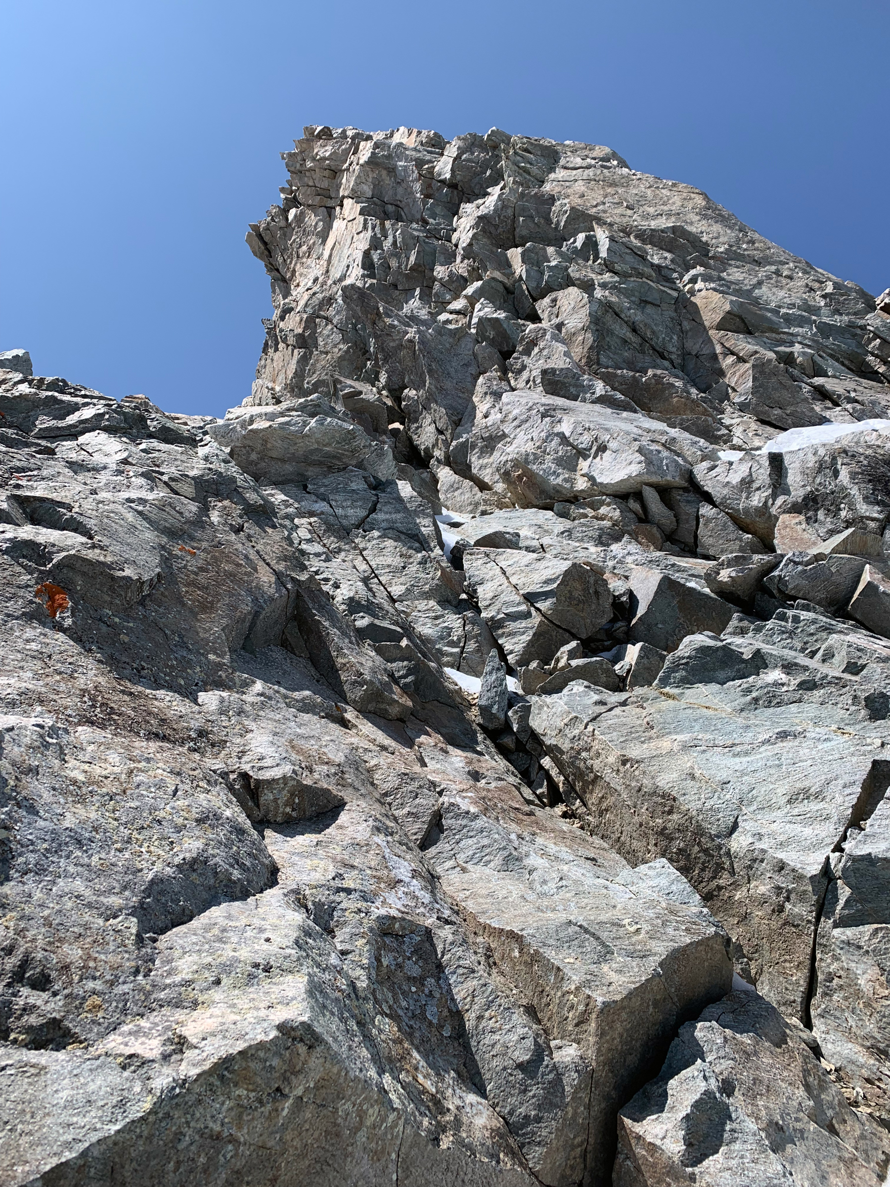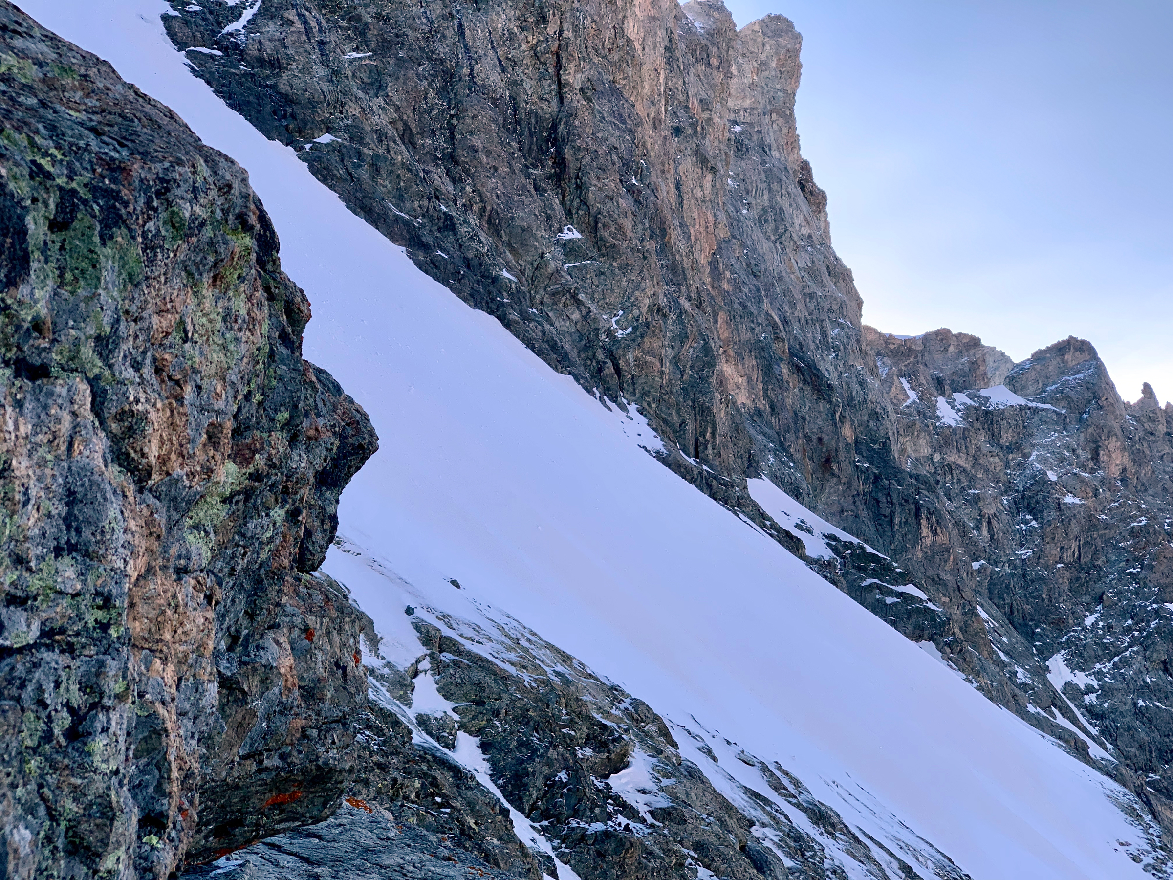 Mathieu me descend en moulinette dans une autre brèche, celle qui précède le Doigt de Dieu. Appelé aussi le Pic Central de la Meije, ce sommet sera les derniers mètres de dénivelé positif de notre traversée — je pourrais presque m’en passer, mais il n’y a pas de voie alternative. Ici, à 3973 m, nouveau dilemme mystique : pourquoi l’appelle-t-on Doigt de Dieu, mise à part sa forme de relique surhumaine ? Son orientation de bas en haut et non de haut en bas est une vraie énigme. Cela veut dire que soit (1) il n’appartient pas à Dieu, céleste par nature, soit (2) Dieu même siège dans cette montagne, de façon animiste. Après 8h d’effort et un certain manque d’oxygène, je conclus que ce doigt doit appartenir à une déesse chthonienne, maîtresse du granite et du gneiss, en colère contre le cosmos pour ses foudres et inconstances. Appelons le « le Doigt de la Déesse », ça me paraît plus plausible.