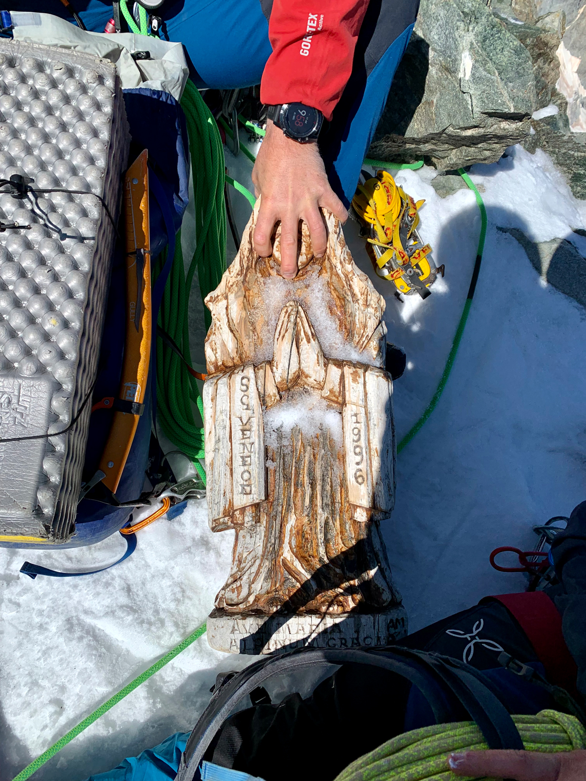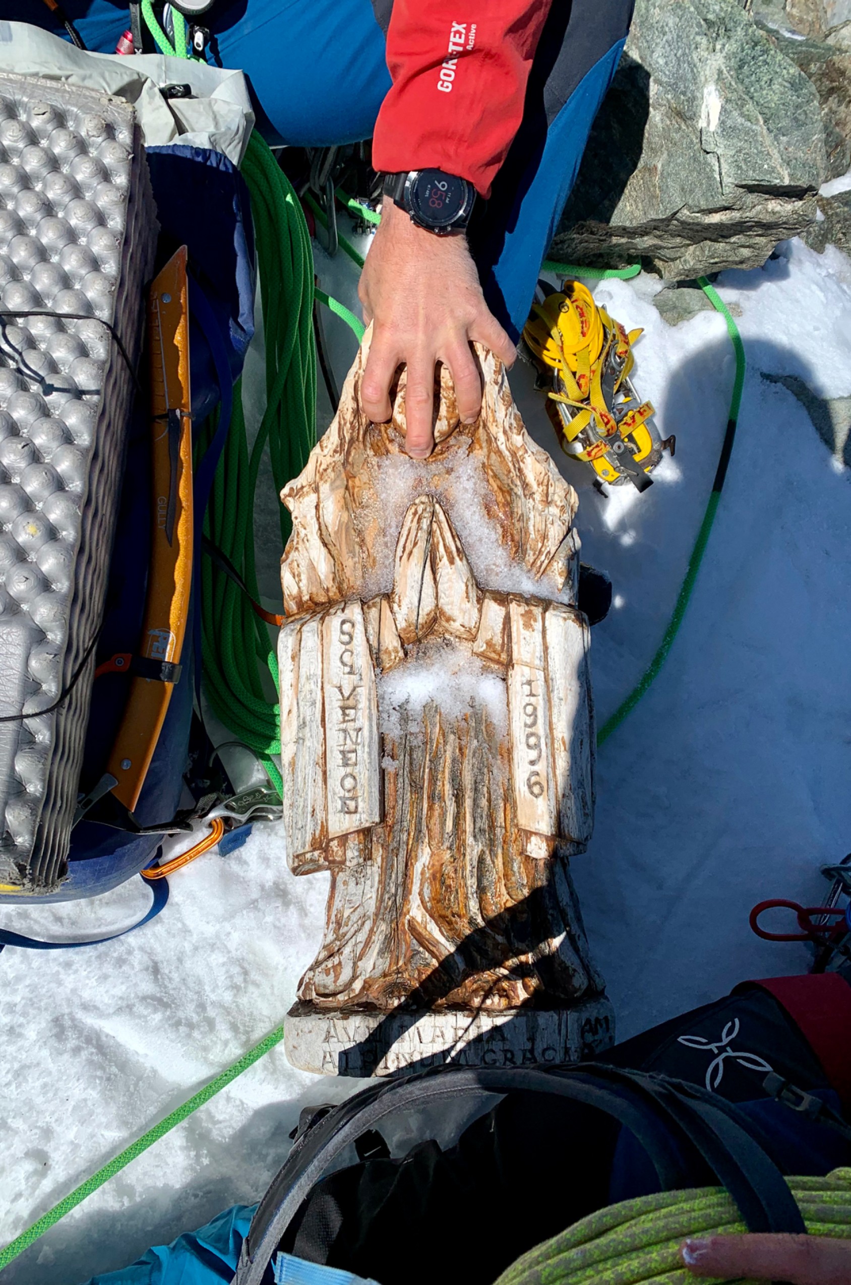 Au sommet, une petite vierge de bois nous accueille. Ou est-ce Jésus ? Pour un moment, l’aspect androgyne de cette déité me rend confuse. L’ancienne statue, la vierge de fer, avait pris la foudre plus qu’une fois, alors on a opté pour une matière plus isolante. D’ici on voit l’arête dans toute sa grandeur : c’est une lame acérée et dentée qui s’étale d’ouest en est ; un plan enneigé, lisse et vertical sur son côté nordique ; un chaos terrible, dénuée et tout effondrée au sud.
