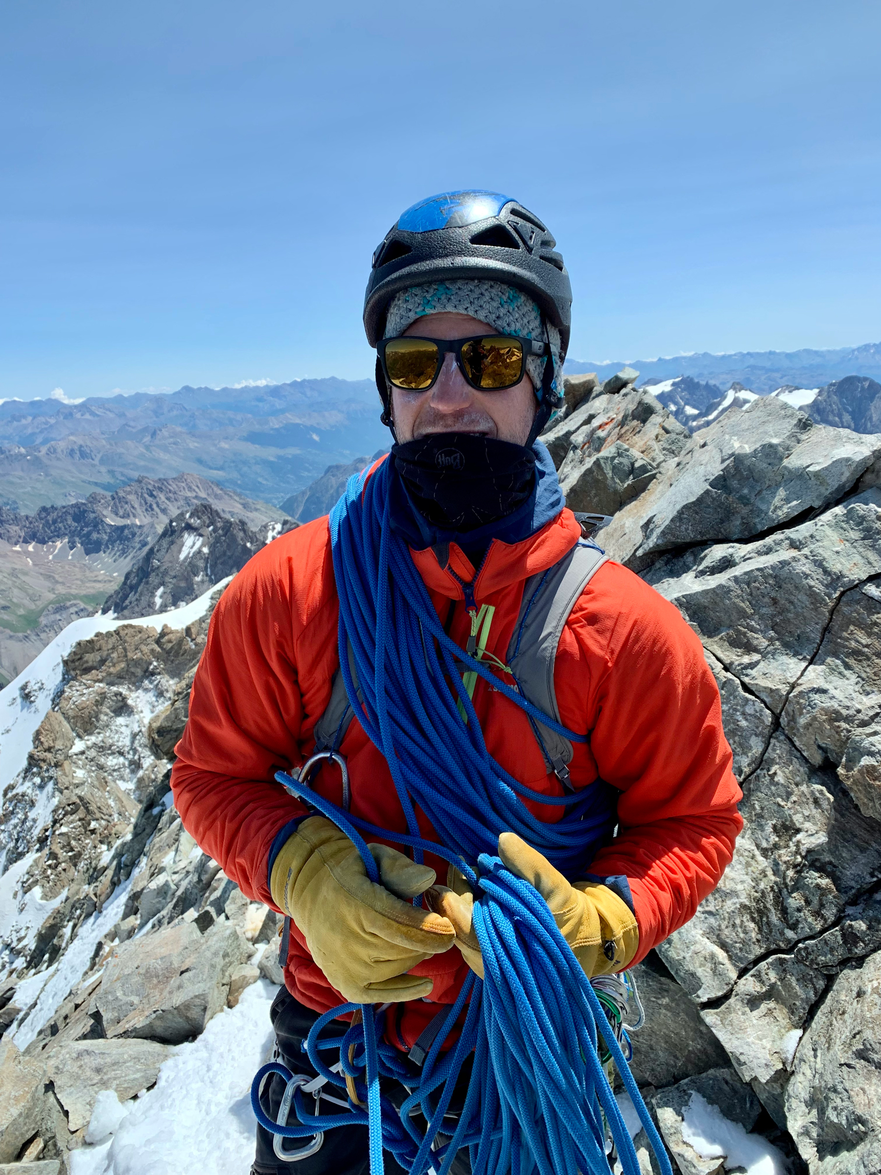 Eau, nourriture et selfies, la routine du sommet. Joie modérée, car je vois mieux ce que Mathieu veut dire par « au sommet, c’est loin d’être fini ». Trois rappels sont nécessaires pour descendre du Grand Pic sur la Brèche Zsigmondy. Lentement, très lentement, je me laisse glisser sur ce brin de corde qui me livre au vide. En plein jour, le vide est omnipotent. Si seulement il pouvait faire encore nuit, juste le temps des rappels !