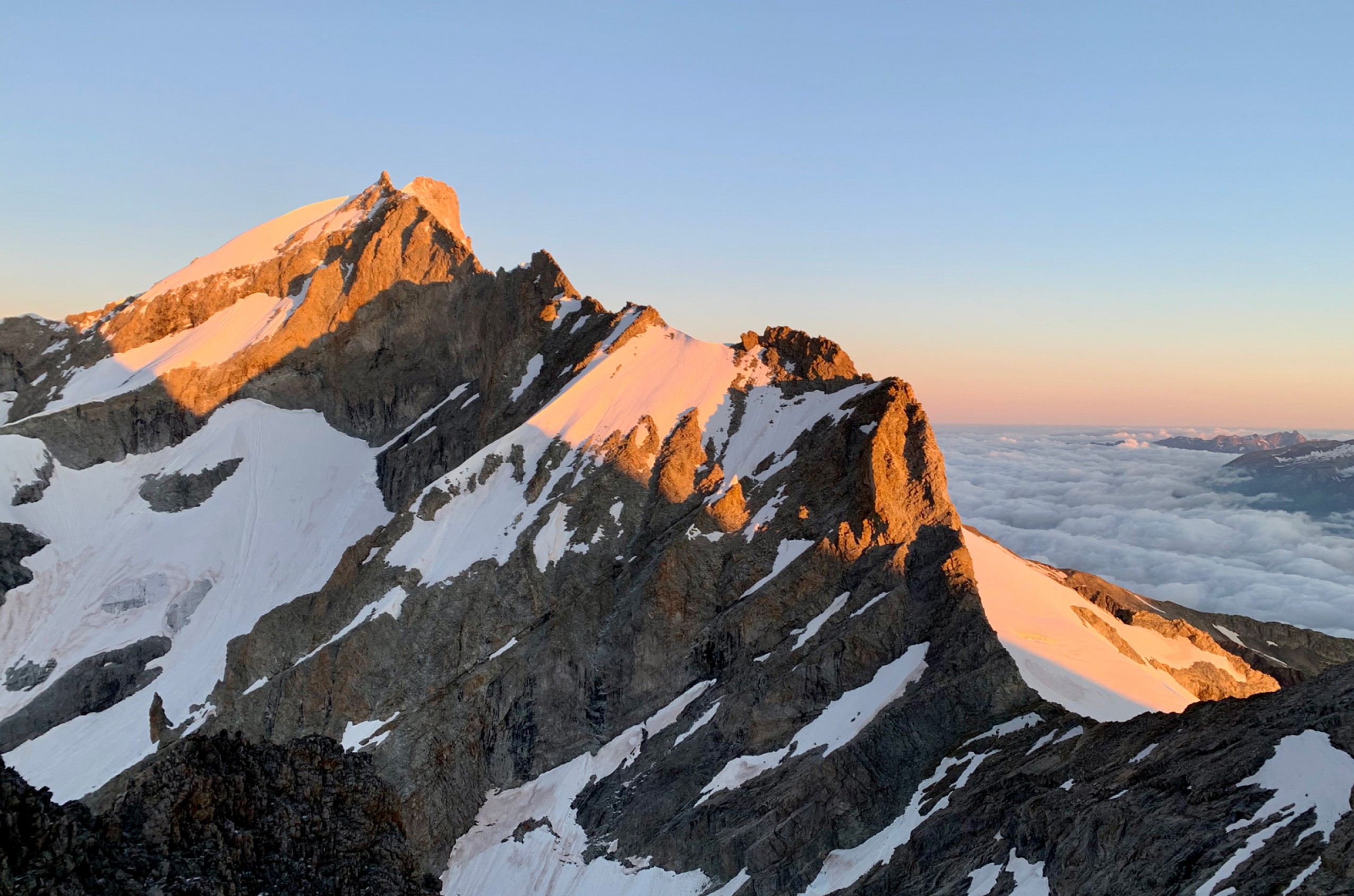 Pour commencer, le Crapaud nous demande le mot de passe et nous autorise à entrer au pays de la Meije, pays des merveilles. Jusqu’au Campement des Demoiselles, les cordées avancent comme des processions de lucioles hypnotisées par leur propre lumière. Le Couloir Duhamel trahit sa sombre réputation et nous offre dans ses ténèbres du confort et de l’abri contre le vent qui souffle fort pour chasser la nuit. L’aube descend sur la Barre des Écrins et chasse à son tour les marées de nuages qui dormaient paisiblement dans la vallée. Les frontales fanent dans la lumière naissante.