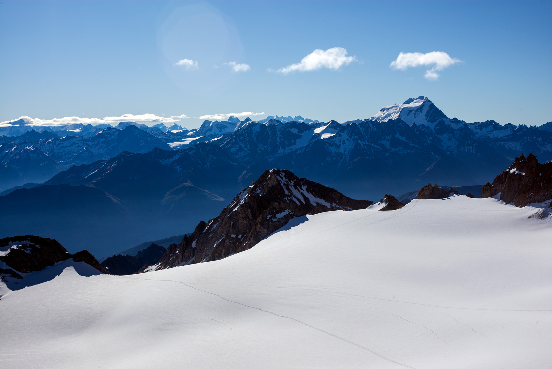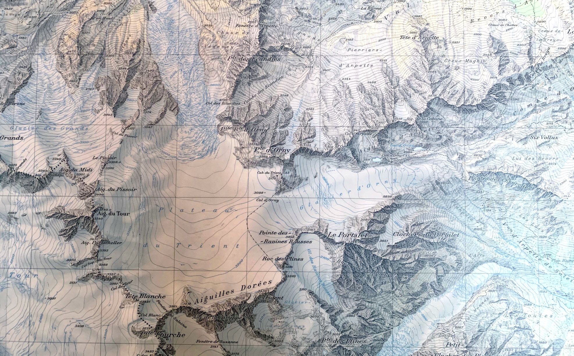 5h. Début de l’ascension depuis le refuge d’Orny. Contrairement aux autres cordées, qui sont toutes descendues tout de suite sur le glacier en sortant du refuge, nous suivîmes la courbe de niveau longeant le versant sud des Aiguilles Tourelle autour de 2900m, pour éviter une descente inutile. Nous enfilâmes les crampons un peu en dessous de la cabane du Trient pour commencer l’ascension du Glacier d’Orny et ensuite la traversée du Plateau du Trient à travers le Col d’Orny (3083m). Rond comme le cadran d’une montre, le Plateau de Trient est un spectaculaire cirque glaciaire encerclé d’aiguilles : les Aiguilles Dorées à 5h, l’Aiguille de la Varappe (3517m) à 6h, l’Aiguille Purtscheller (3474m) à 8h, les Aiguilles du Tour avec les deux pointes de 3541m et 3540m à 9h, les Aiguilles du Pissoir (3439m) et les Aiguilles du Midi (3300m) qui ne sont pas du tout à midi, mais à 10h. Après cette longue traversée montante, l’ascension finale se fit sur les éboulis grossiers et assez vertigineux de la pointe sud des Aiguilles du Tour (3540m). D’en haut, la carte des Alpes se déplie à échelle réelle et en relief devant nous : le massif du Mont Blanc au sud-ouest et le Mont Rose à l’est. Un peu plus loin, on devine même les Alpes Bernoises, avec le profil abrupt de l’Eiger.