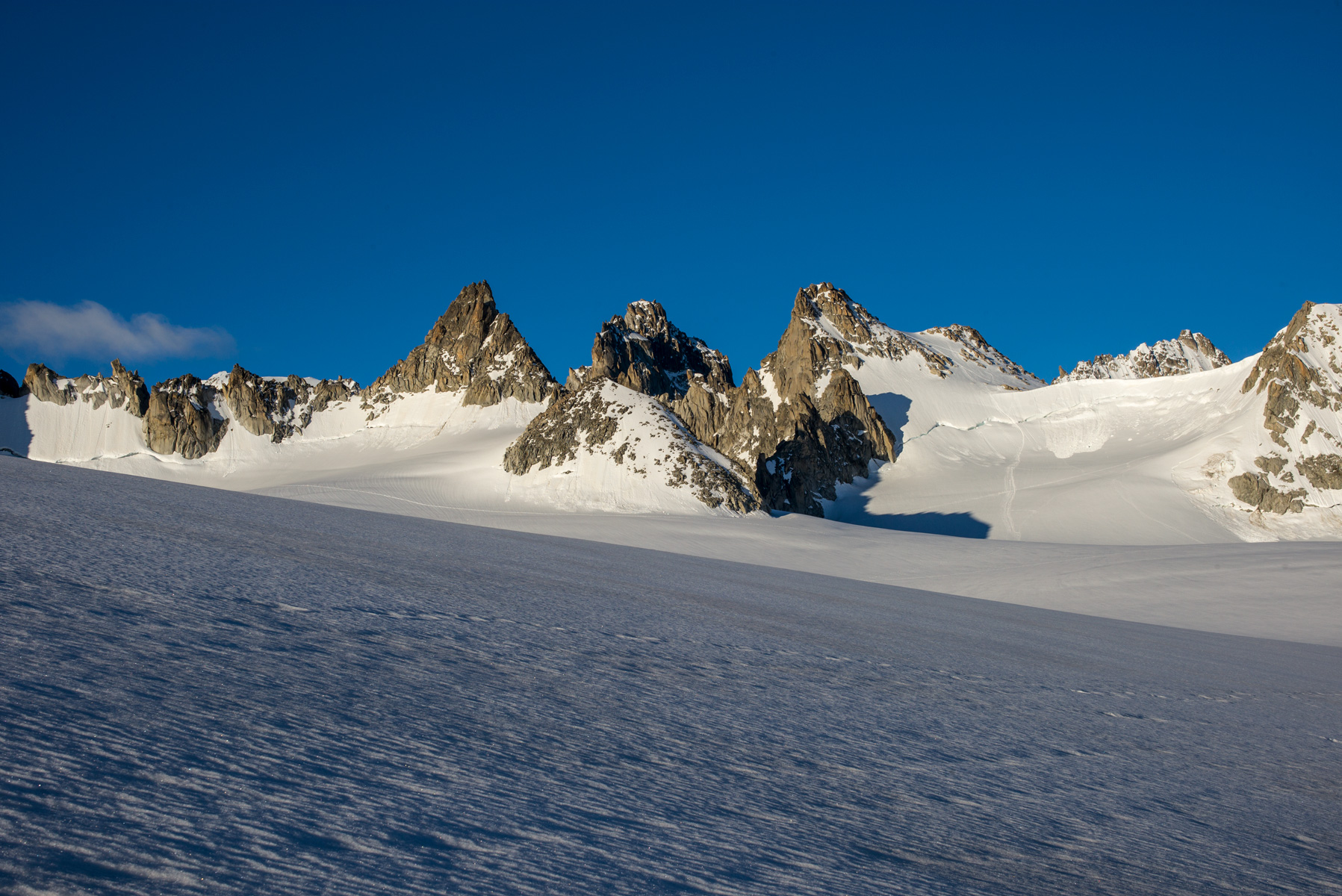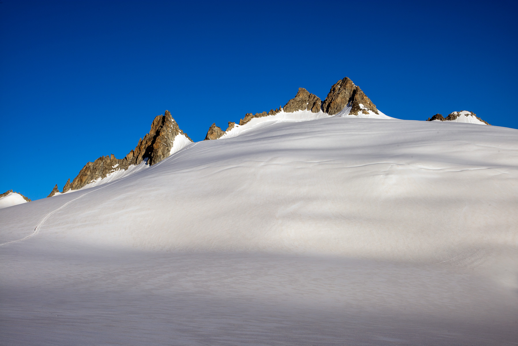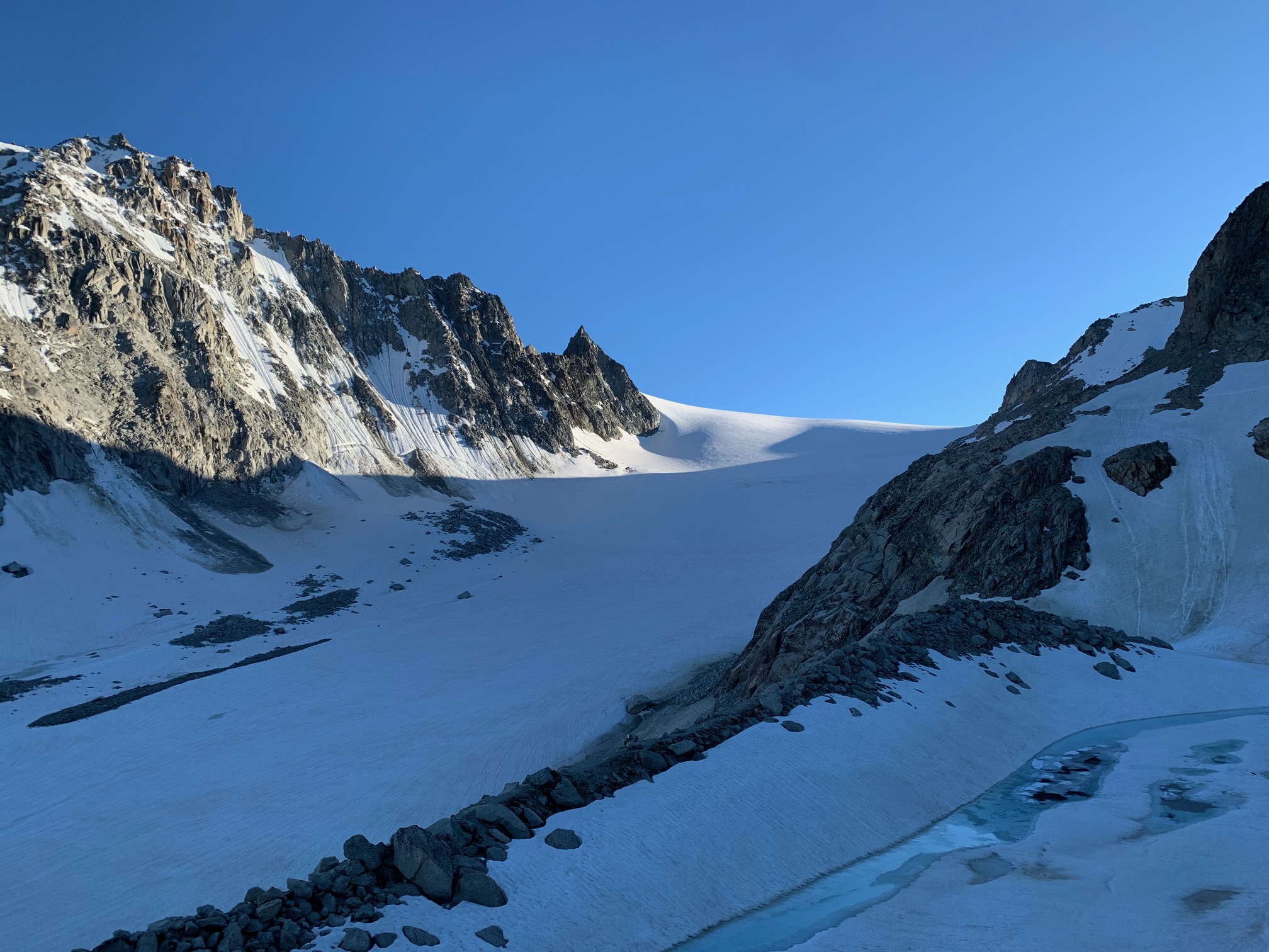 Souvent, les marches d’approche sont cette étape fade et inévitable qui nous permettent d’accéder aux refuges, les seuls avant-postes des sommets qui méritent d’être évoqués. La marche jusqu’à la cabane d’Orny fût tout sauf fade : laissant derrière la vallée de Champex et passant à côté du Grandiose Combin –parce que l’épithète de “Grand” ne rend pas justice à la prestance de ce sommet–, nous nous enfonçâmes dans le paysage glaciaire au fil du Torrent du Darbellay, que nous remontâmes sur des éboulis et puis de la neige. “Là, à gauche, c’est le Petit Clocher du Portalet, un des lieux mythiques de grimpe”, dit notre guide en nous indiquant une paroi de 200m extrêmement lisse et verticale. Peu après, nous rejoignîmes le refuge sur un isthme de neige, humbles comme des fourmis qui transgressaient un temple bordé de monolithes de granite : l’Aiguille du Glacier Rond et les Aiguilles d’Arpette à droite et le Portalet à gauche.