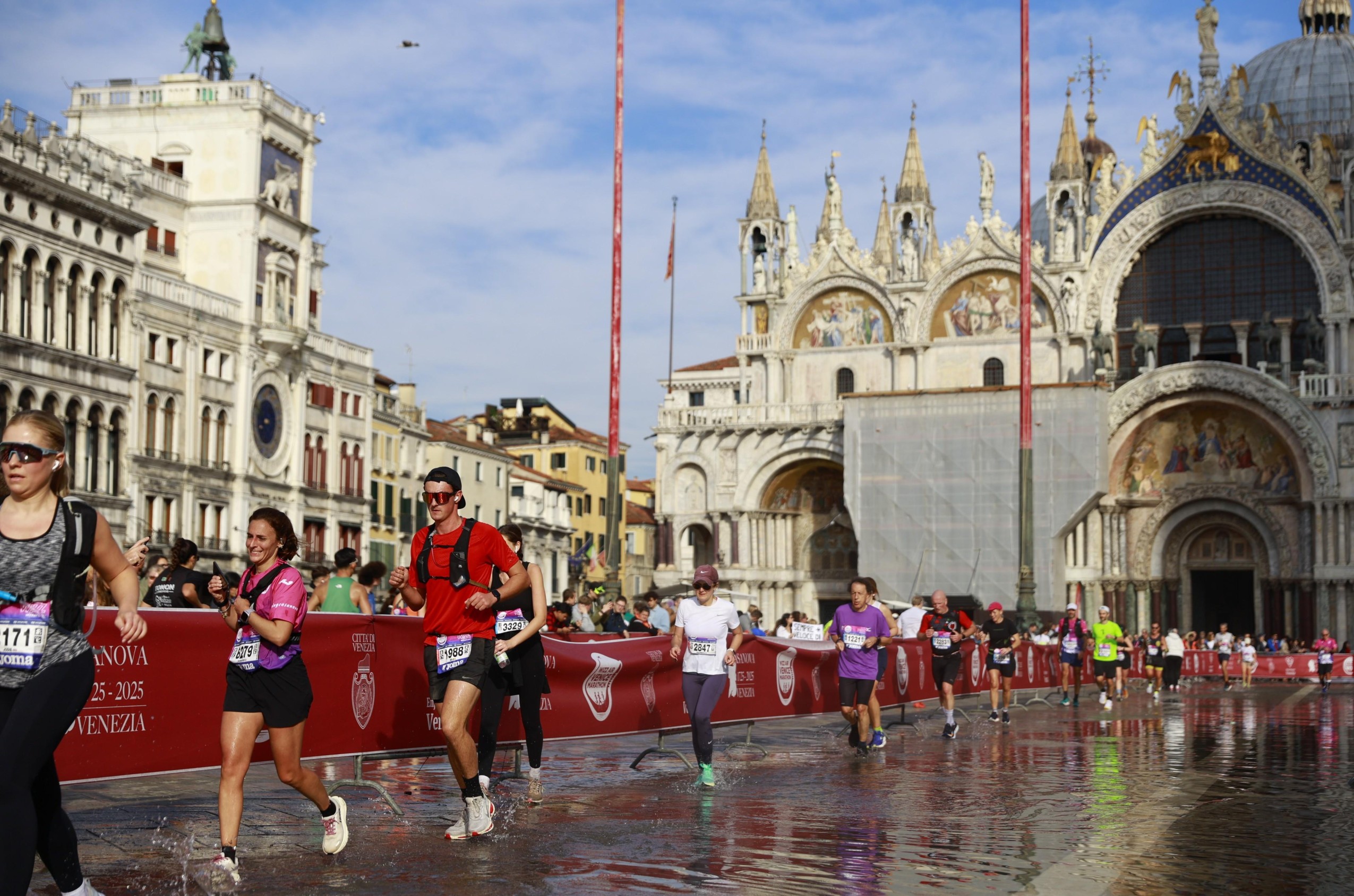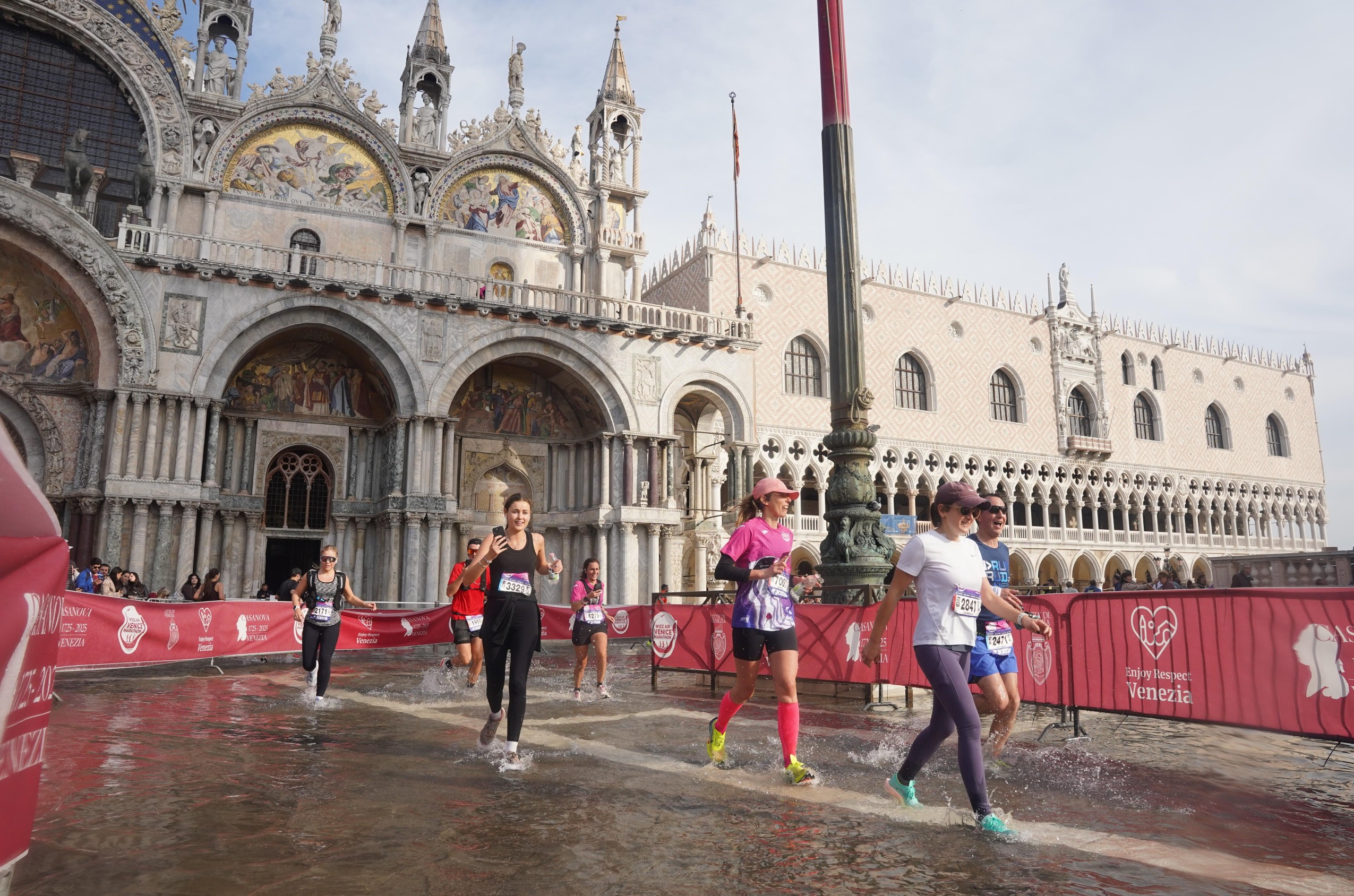 Km 39 : l’illusion d’avancer. Le parvis de San Marco est inondé, on fait semblant de courir, on nage. Mes chaussures ultra-light sont un tamis, mais l’eau froide apaise la cheville en surchauffe. Sous l’eau, je zappe le panneau du km 40.