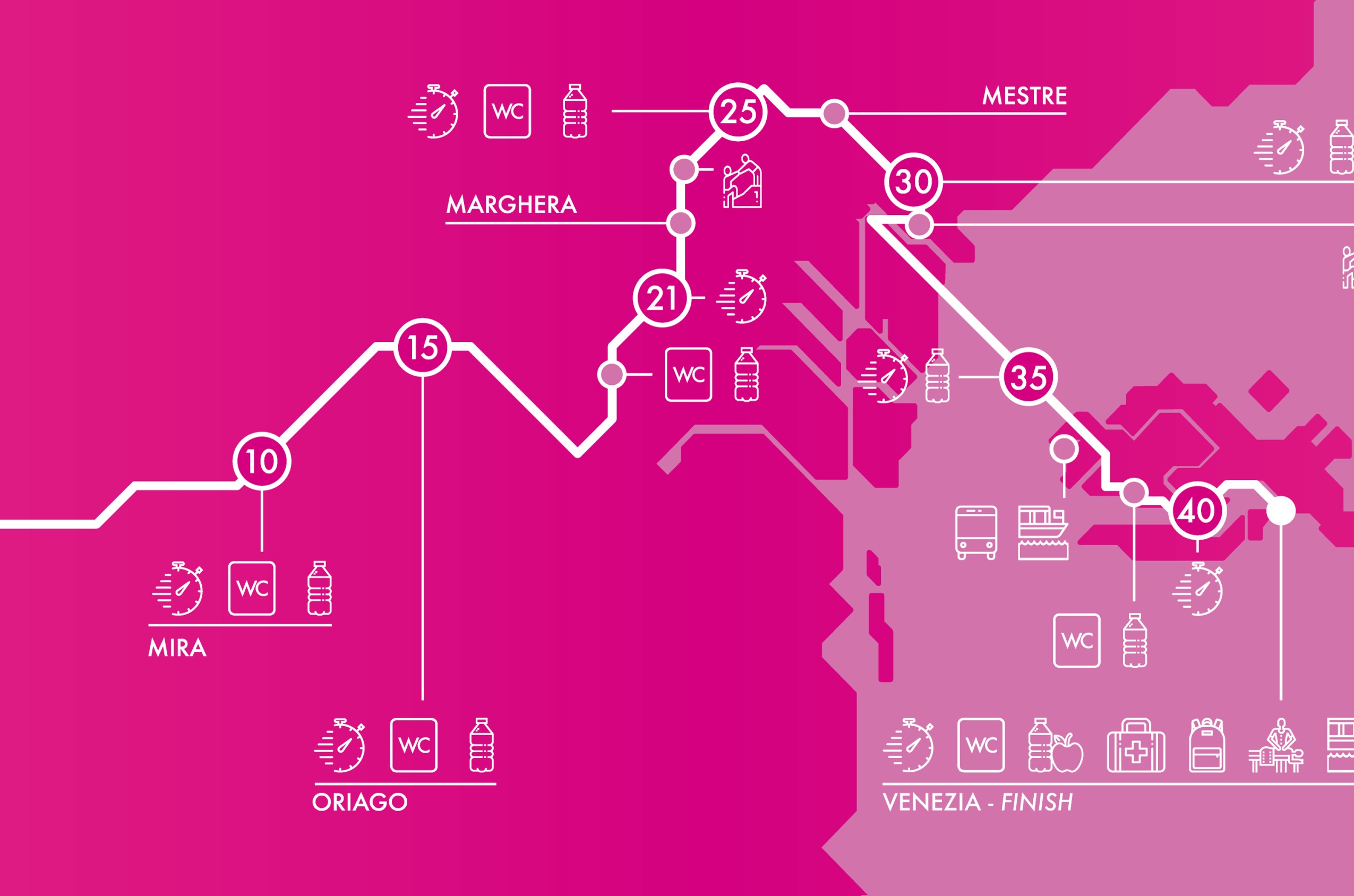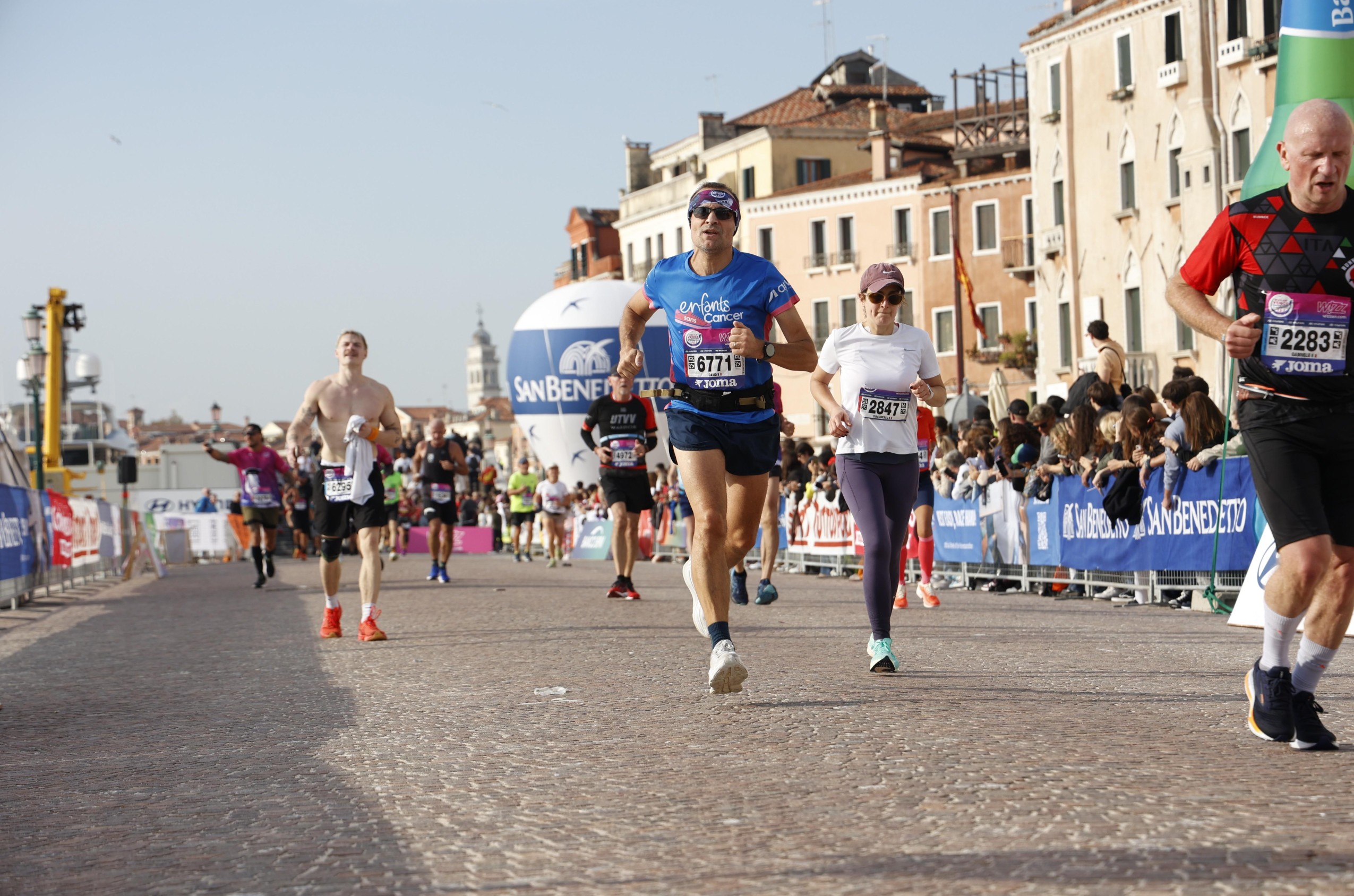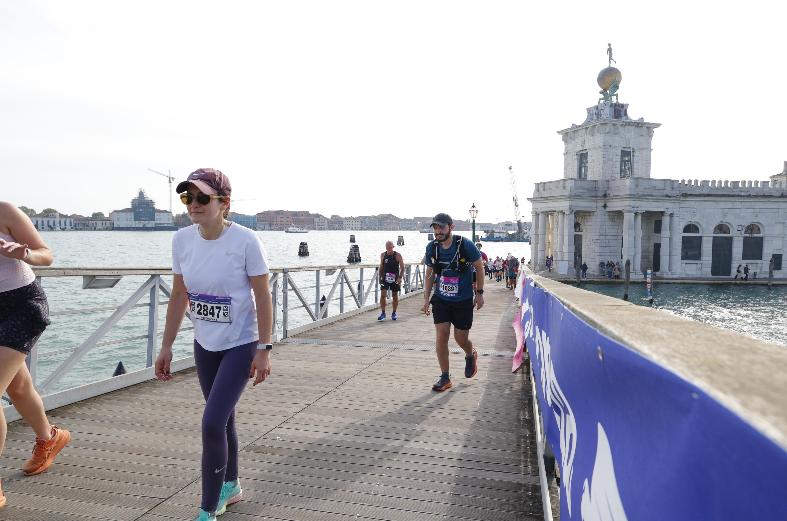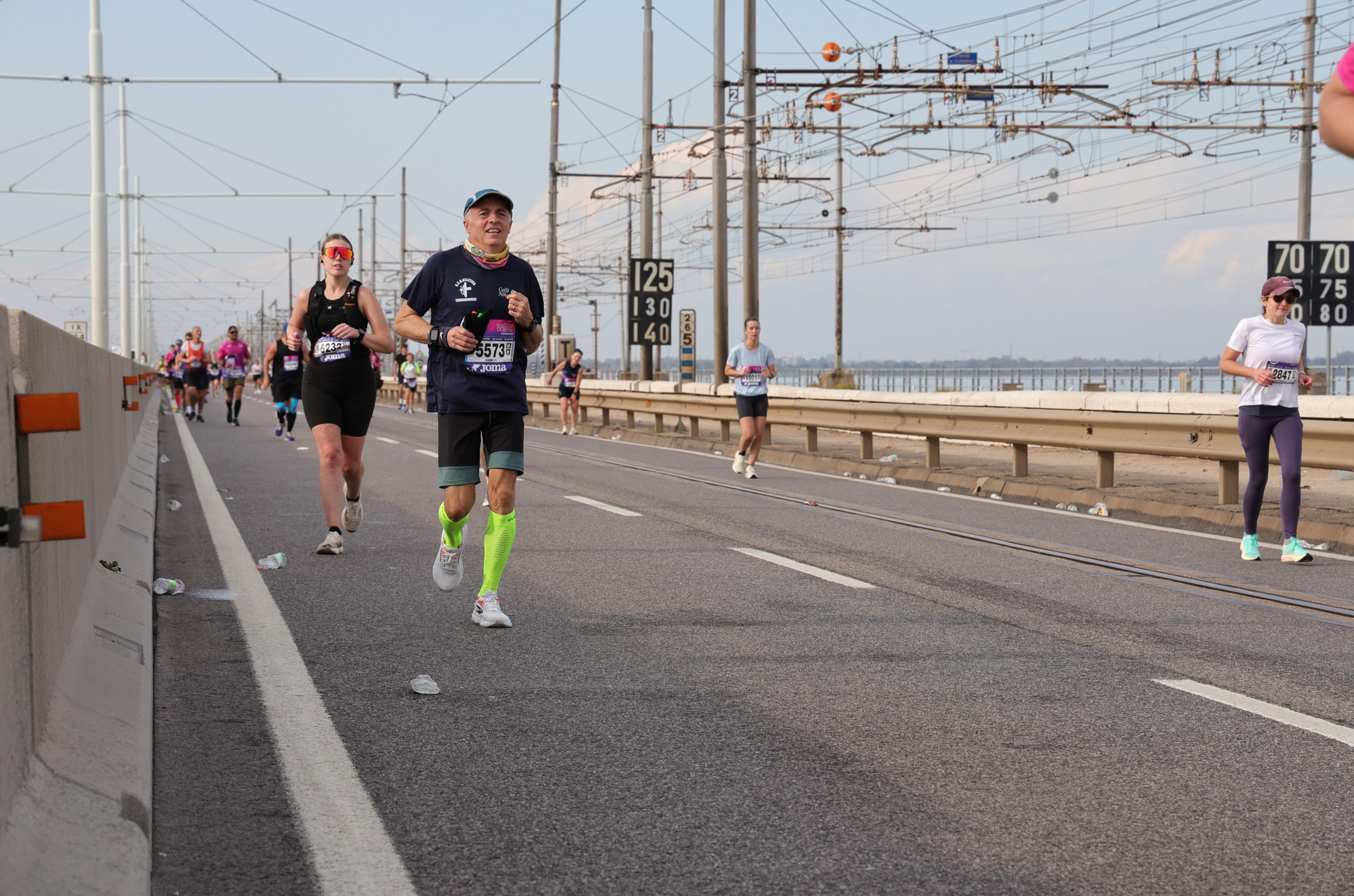 Km 35, Ponte della Libertà. Quatre kilomètres en ligne droite qui relient Venise à la terra ferma : un pont ferroviaire, inauguré en 1846, et un ruban de béton, inauguré par Mussolini en 1933 sous le nom de « Ponte Littorio ». J’ai l’impression de courir au ralenti. La deuxième vague des ballons bleus me double : je viens de sortir de l’intervalle de 6:15/km. Ce n'est pas le pont de la liberté, c'est une interminable highway to hell. À l’horizon, Venise scintille comme une Fata Morgana.