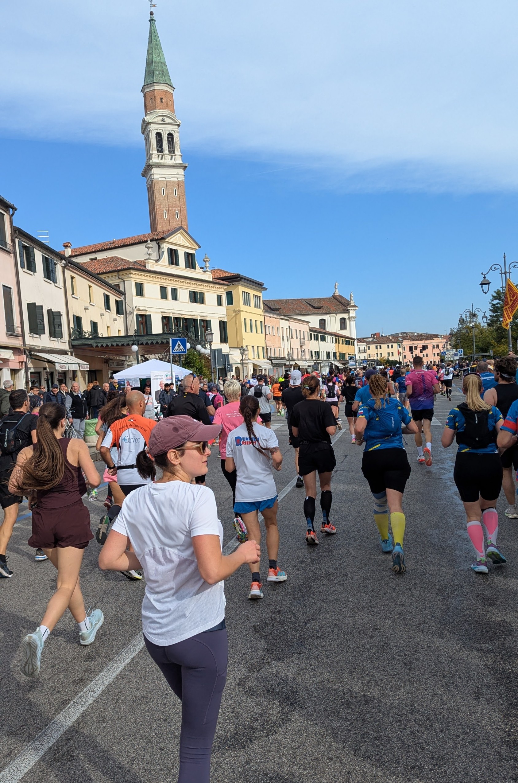 Km 5, Dolo. Tout va bien. Premier ravito, un peu d’eau, on déroule, malgré la densité de coureurs, qui fusent chaotiquement de partout. Je suis ravie de mes chaussures ultra-légères, je ne les sens même pas !