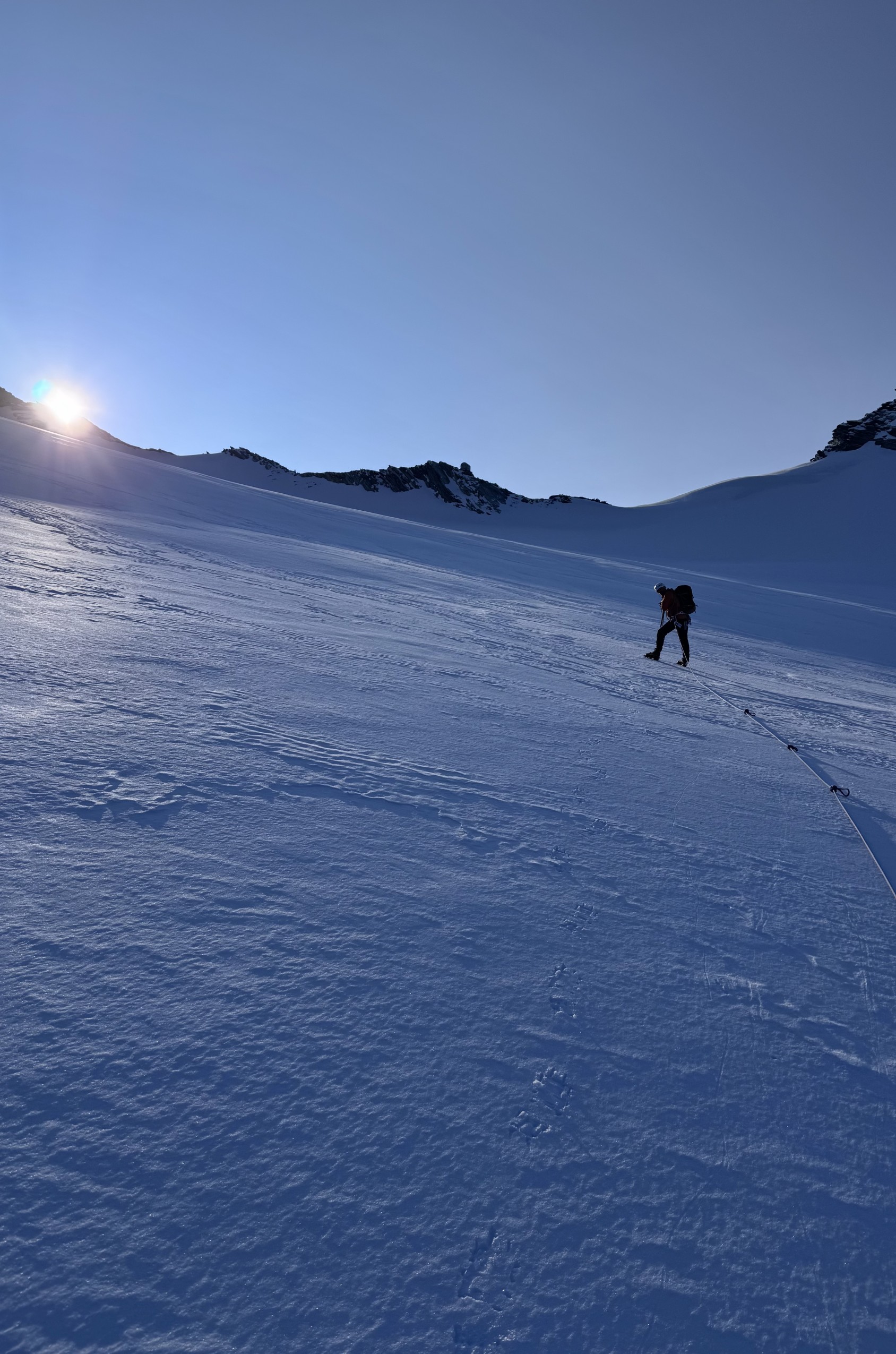 7h20. Le glacier des Grandes Murailles ressemble à un immense amphithéâtre structuré en trois gradins. Au pied du col de Tiefenmatten, nous sommes sur le premier, autour de l’isohypse 3 300 m. L’autre cordée, partie quarante minutes avant nous, vient d’atteindre le col. On se salue en agitant les bras comme des hélices, puis nous reprenons notre chemin sur le glacier, eux le leur sur la crête.