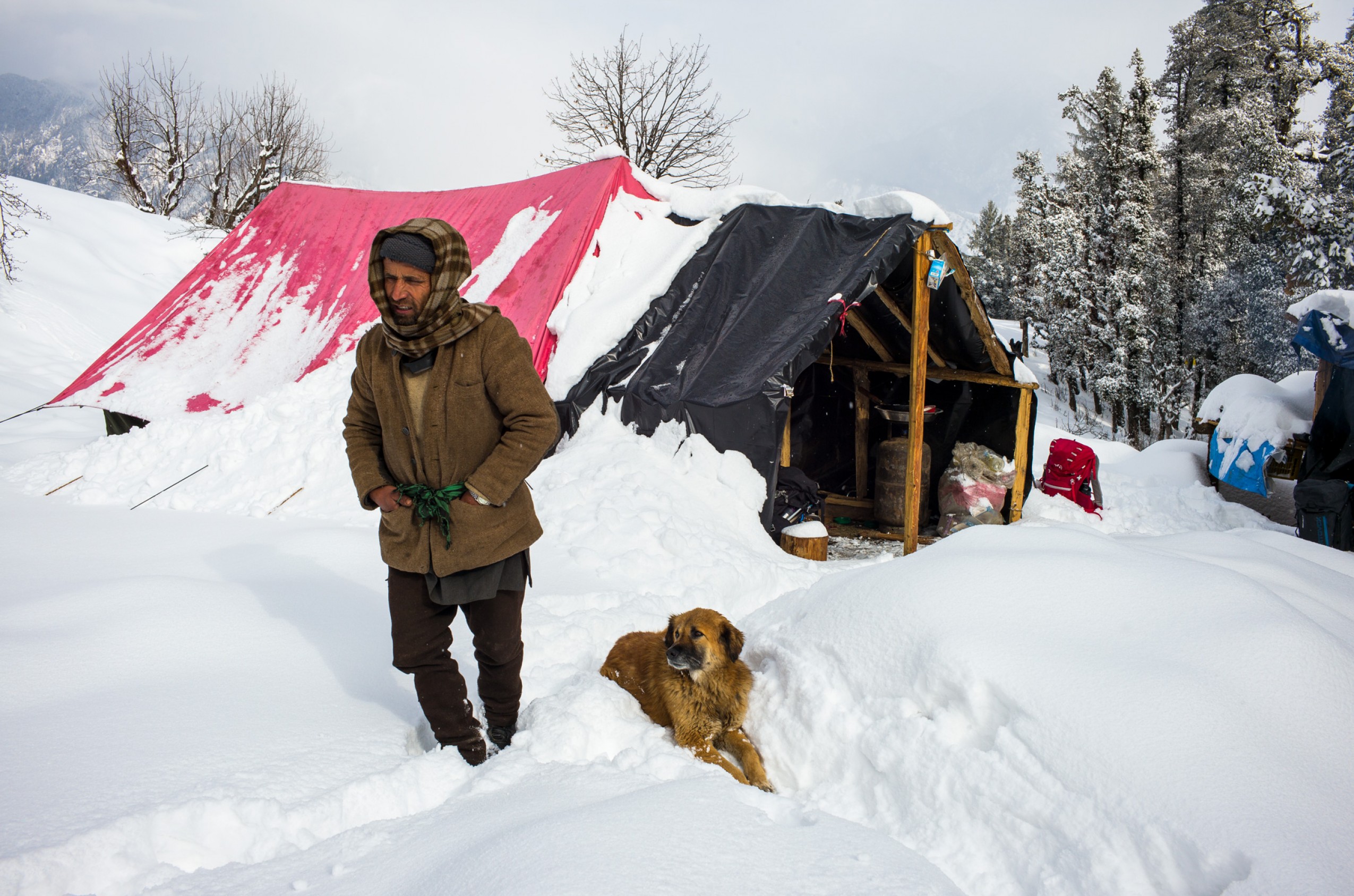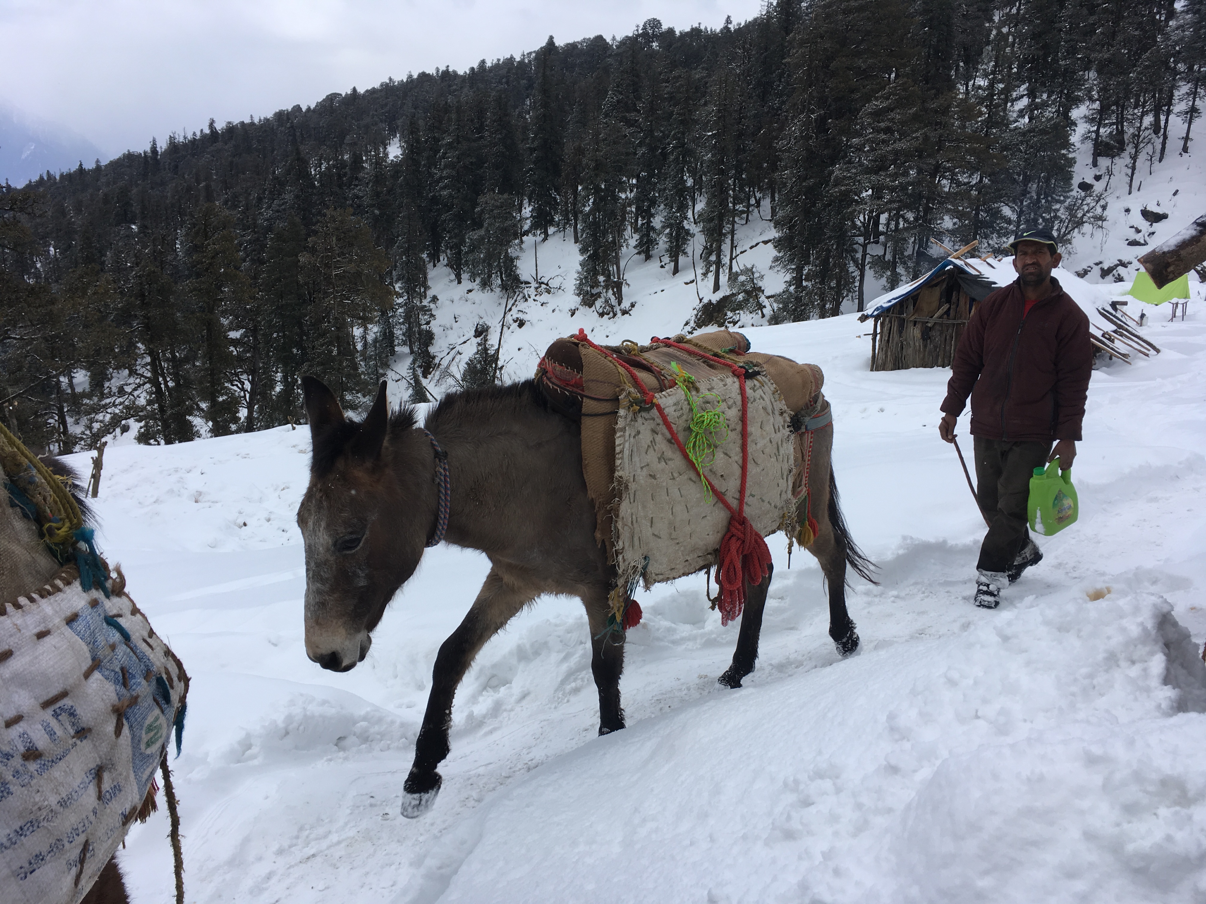 À l'aube, on prend le petit déjeuner avant que Pankaj charge les mules de nos bagages. On n'a pas de gros bagages et l’on essaie de porter nous-mêmes le maximum, mais les mules ont plein d'autres choses à transporter, des bouteilles de gaz et des sacs rugueux de jute remplis des vivres pour les cuisines des camps de bases. Les bêtes sont assez adroites, même sur les sentiers plus raides, menés de derrière par les "ha!" de leurs maitres Sherpas. Après quelques heures (quatre heures ? cinq heures ? je ne pourrais pas dire) de marche et de nombreuses pauses chaï, nous arrivons à Jadu Ka Talab (2773 m), le lieu où nous allions camper pour la nuit, pour la première fois dans des tentes sur la neige. Le paysage commence à s'ouvrir et la neige couvre les alentours, les arbres. Plusieurs compagnies de guides ont implanté des clusters de tentes autour d'une tente maitresse : la cuisine. La nourriture est fantastique et nous attendons avec une impatience pavlovienne chaque repas. On ne s'imaginait pas que la nourriture faite dans ces conditions-là pourrait être si délicieuse et bonne – on n'a pas eu le moindre problème digestif pendant le trek.