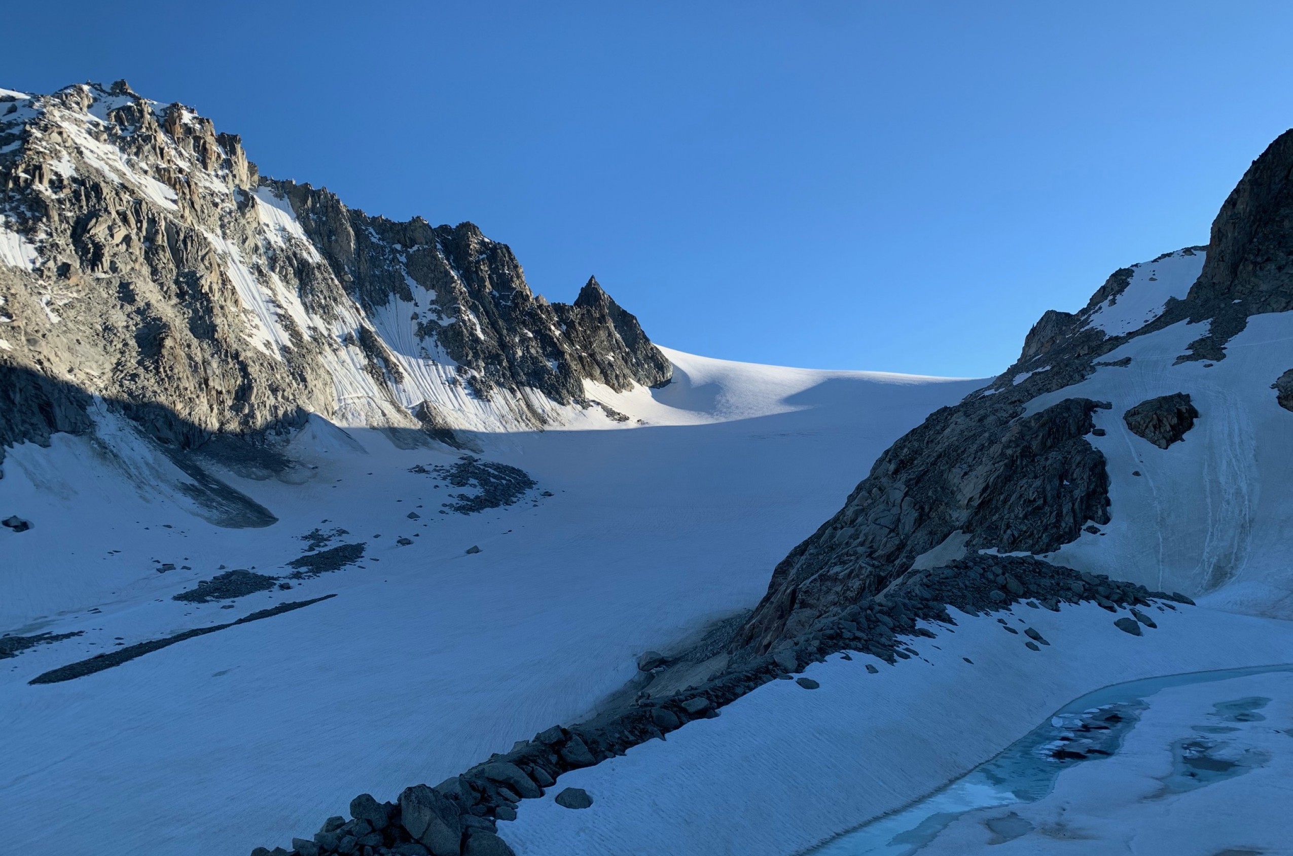 Souvent, les marches d’approche sont cette étape fade et inévitable qui nous permettent d’accéder aux refuges, les seuls avant-postes des sommets qui méritent d’être évoqués. La marche jusqu’à la cabane d’Orny fût tout sauf fade : laissant derrière la vallée de Champex et passant à côté du Grandiose Combin –parce que l’épithète de “Grand” ne rend pas justice à la prestance de ce sommet–, nous nous enfonçâmes dans le paysage glaciaire au fil du Torrent du Darbellay, que nous remontâmes sur des éboulis et puis de la neige. “Là, à gauche, c’est le Petit Clocher du Portalet, un des lieux mythiques de grimpe”, dit notre guide en nous indiquant une paroi de 200m extrêmement lisse et verticale. Peu après, nous rejoignîmes le refuge sur un isthme de neige, humbles comme des fourmis qui transgressaient un temple bordé de monolithes de granite : l’Aiguille du Glacier Rond et les Aiguilles d’Arpette à droite et le Portalet à gauche.