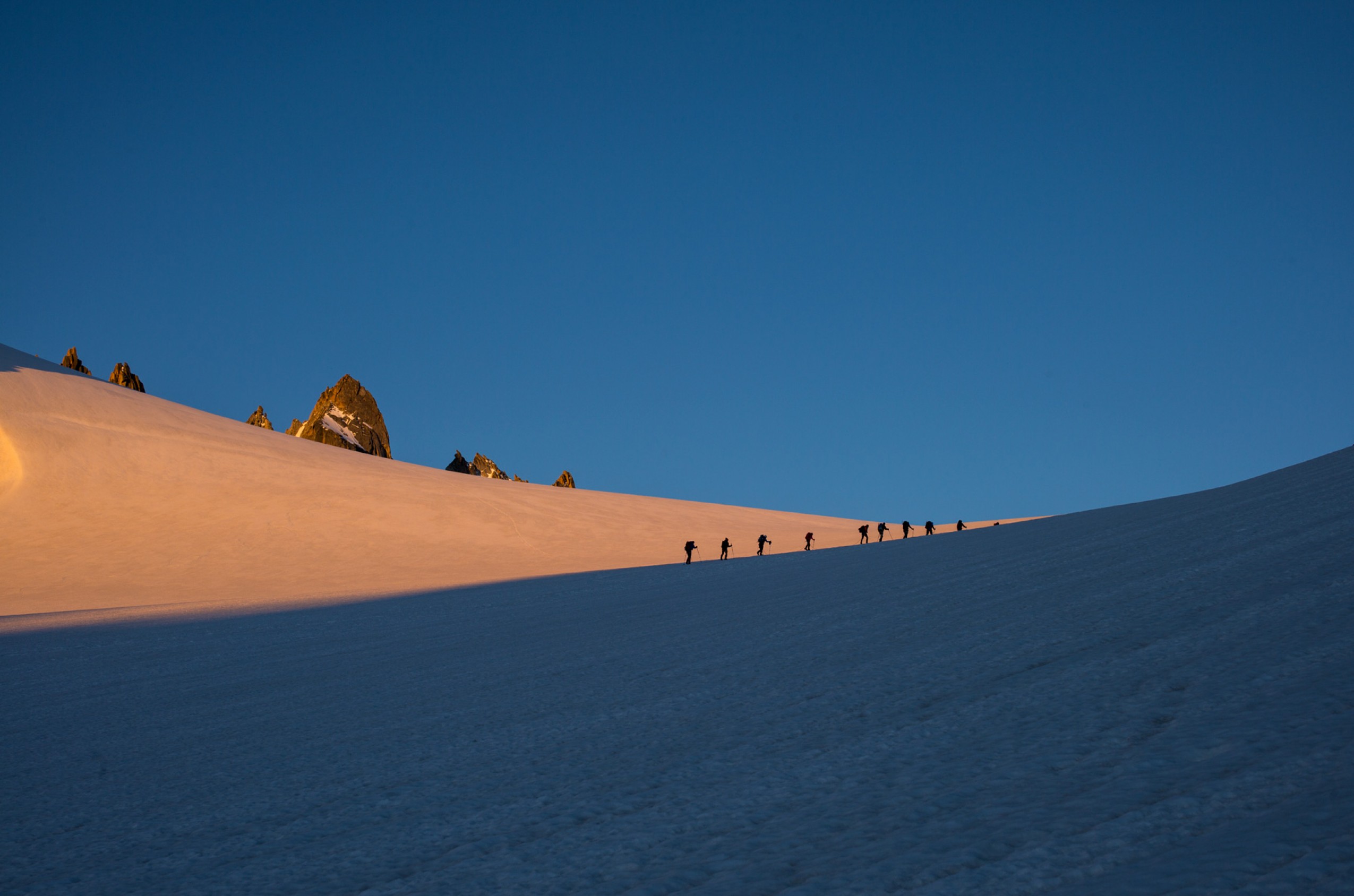 Là haut, on jauge le temps par des moyens autres que les minutes ou les heures. La première unité de mesure c’est le pas. Un, deux, trois, trois cent quatre, les pas s’enchaînent au rythme des bâtons qui frappent les rochers avec le cliquetis de la trotteuse d’une montre. Après quelques essais diligents, on perd le fil et le compteur repart de zéro jusqu’au moment où on rentre dans une sorte de geste machinal où on ne compte plus du tout. Parfois, c’est le pouls qui donne la cadence, amplifié par l’inclinaison de la pente. Quand le cœur se met à ronronner tranquillement, on sait qu’il fait au moins une demi-heure de marche et que l’on est bien échauffés. Une autre mesure c’est la température de couleur : d’abord du noir moucheté et jauni par les faisceaux des frontales ; c’est le moment où l’on se pose pas de questions, on ne pense à rien d’autre que le prochain pas ; ensuite l’heure bleue et l’heure dorée, c’est le signe de deux bonnes heures de marche. Pendant l’ascension, le temps ne se divise pas en secondes ni minutes, mais en battements de cœur, souffles et halètements, degrés Celsius et kelvins, pauses eau et le niveau du thé dans la gourde, cordées doublées, crissements de crampons, crevasses franchies, dénivelé positif et négatif. Avec l’expérience, on apprend à lire ces signes du temps.