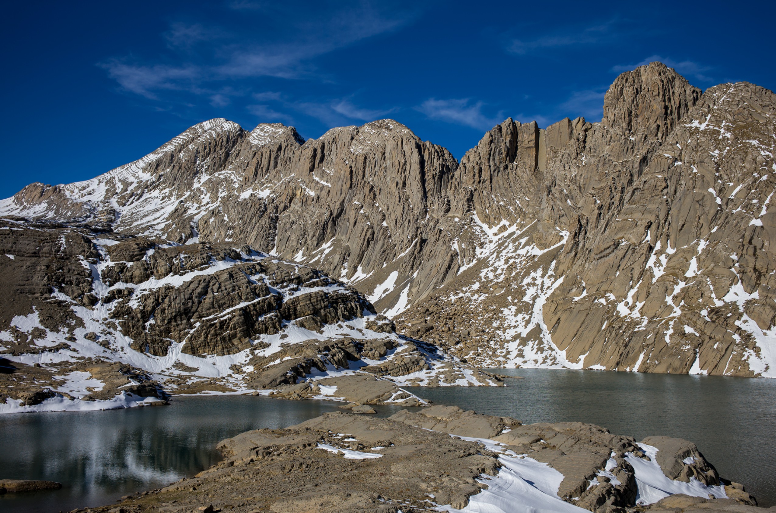 L’aventure commence au parking du barrage des Gloriettes en début d’après-midi, où nous éprouvons pour la première fois tout le poids d’un sac à dos bourré en nourriture et matériel pour trois jours d’autonomie : pas moins de 20 kilos chacun. C’est nouveau pour moi, pendant les courses d’alpinisme je me limite à 8 kilos. Le chemin traverse le barrage, puis part sur la droite du lac et remonte le gave qui l’alimente. La neige tombée la veille cache le chemin et nous pousse à gauche et à droite dans le tapis de génépis et rhododendrons. Plus nous avançons vers le bout du cirque d’Estaubé, plus les parois se serrent autour de nous comme un étau. De droite à gauche, le Pic Rouge de Pailla (2 780 m), le Grand Astazou (3 071 m), le Pic de Tuquerouye et le Pic de Pinède (2 859 m), séparés par de petites brèches comme les créneaux d’une forteresse, ne laissent pas deviner la route vers le refuge. On pense, à tort, que le Port Neuf de Pinède sera notre destination : il semble être la seule voie d’accès à la ligne de faîte de cette muraille.
