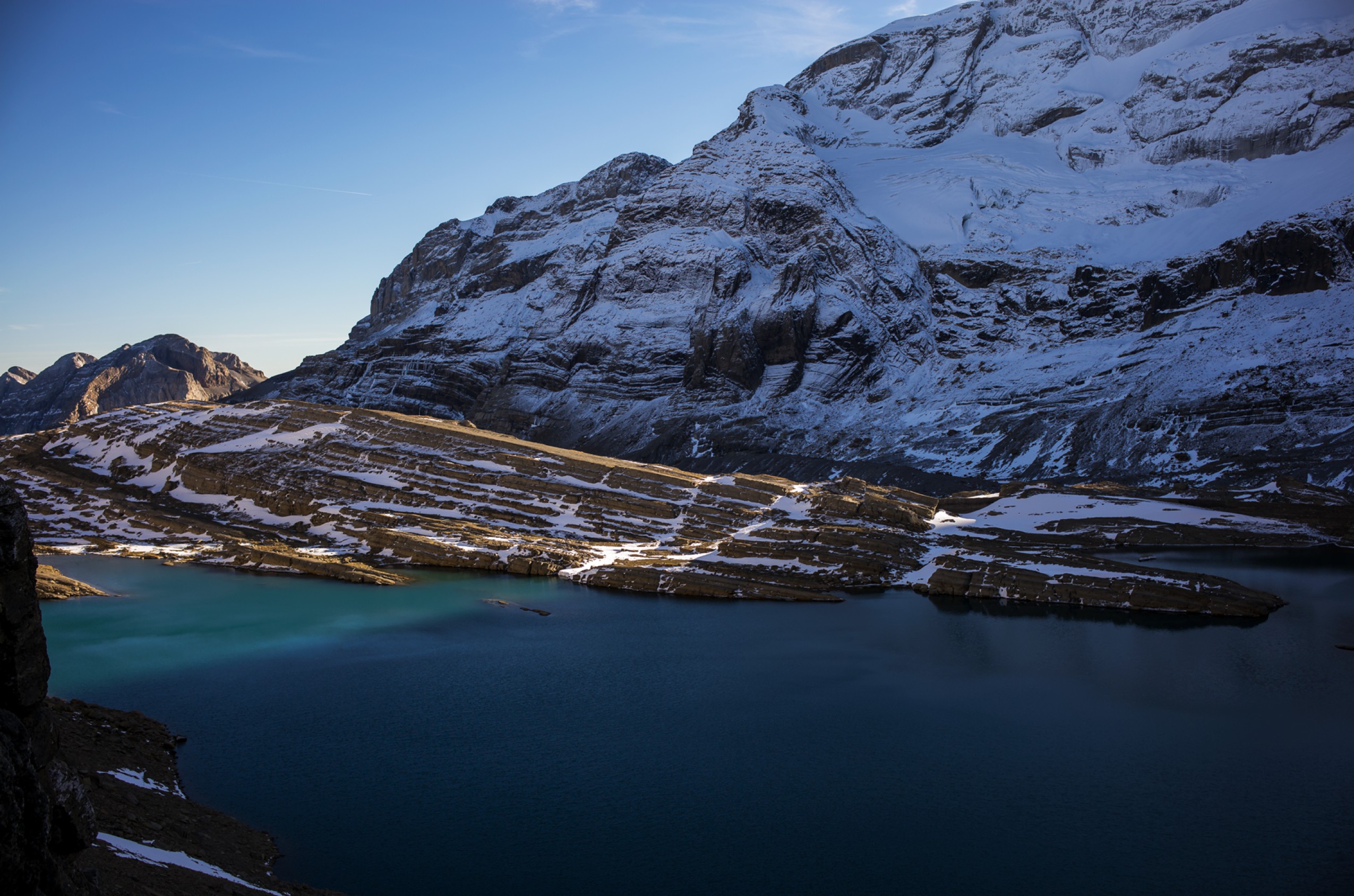 Le matin, après un Earl Grey à la neige fondue et un œuf dur, nous partons à la découverte du versant méridional espagnol, en direction du Mont Perdu (3 355 m) et du cylindre du Marboré. Entre les pics de Tuquerouye et de Pinède, un autre couloir d’éboulement nous ramène au lac Glacé du Marboré en moins de 15 minutes. D’un bleu turquoise éblouissant, le lac ressemble plutôt à un lagon tropical ou à un saphir. Après l’expérience hivernale nocturne d’hier, ce bain de lumière semble divin.