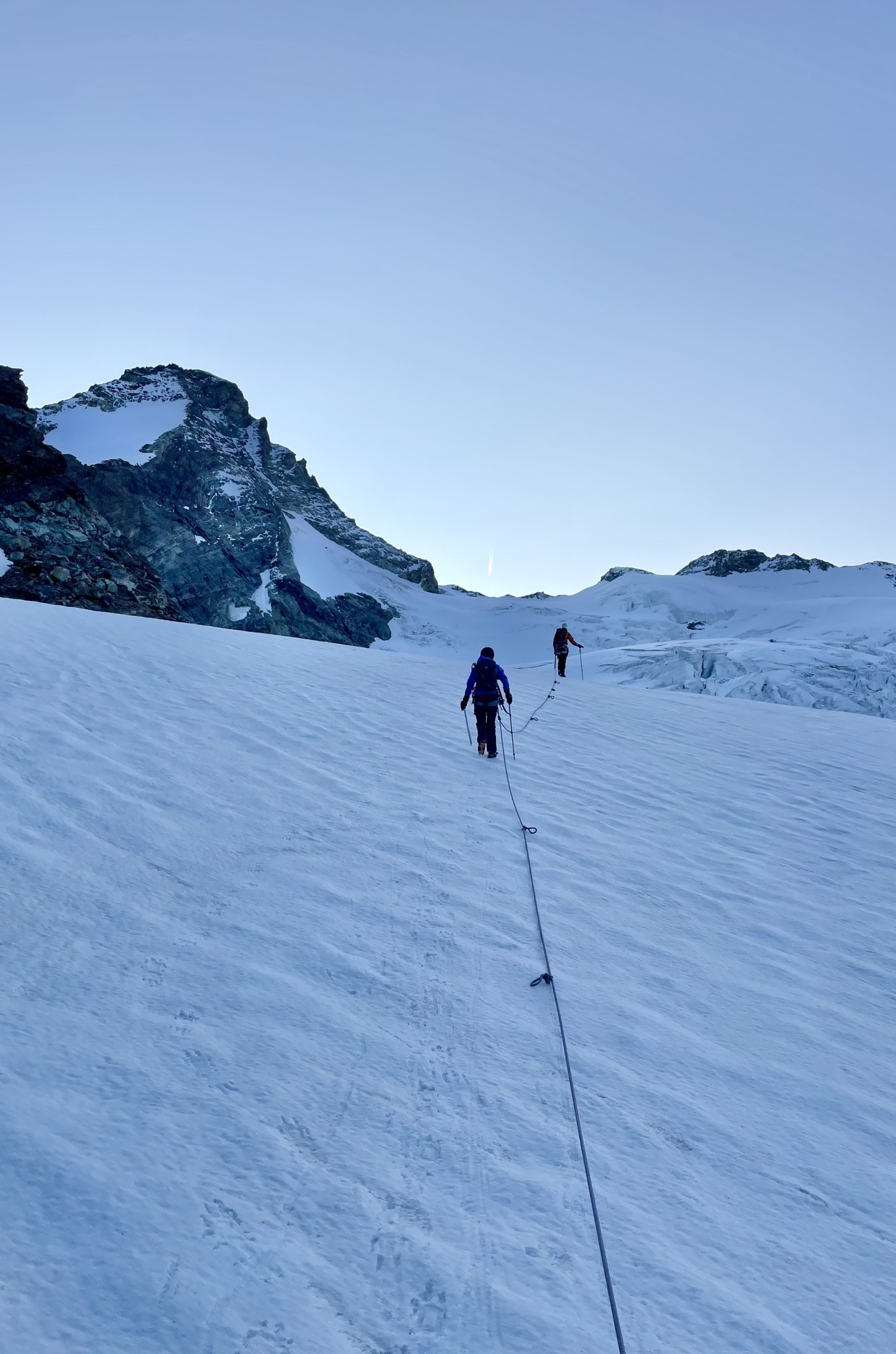Depuis le gendarme est, on commence la traversée descendante d’une pente de neige à 60–70°, jusqu’à un ressaut rocheux qui trône au milieu. C’est mon tour. Lancelot m’assure d’en haut, Julien m’attend déjà sur le ressaut. J’avance avec diligence face à la pente, dans une neige qui a la consistance des aigrettes de pissenlit. Au début, elle tient ; puis, d’un coup, je ne sens plus rien sous mes pieds. Je glisse — je gliiiiiiisse ! Le piolet ne mord plus. Je culbute entre les brins de corde, qui arrêtent ma glissade une dizaine de mètres plus bas. Mon kit crevasse — broche à glace, deux poulies autobloquantes, descendeur — s’arrache de mon baudrier et file dans le vide. Une seconde glissade, plus courte, achève de me déstabiliser. Je hyperventile ; mon corps se met à trembler. « Tu vas bien ? ». Non. Non, pas vraiment. Réunis sur le ressaut, on regarde le glacier tout en bas, très loin. Comment redescendre ? Pour l’instant, je suis défaite, prête à capituler, à appeler les secours coûte que coûte. Mais Lancelot, d’un calme glacial, trace une stratégie de descente. Il demande l’heure. Il dit que c’est faisable. Une part de moi le croit, l’autre reste incrédule.