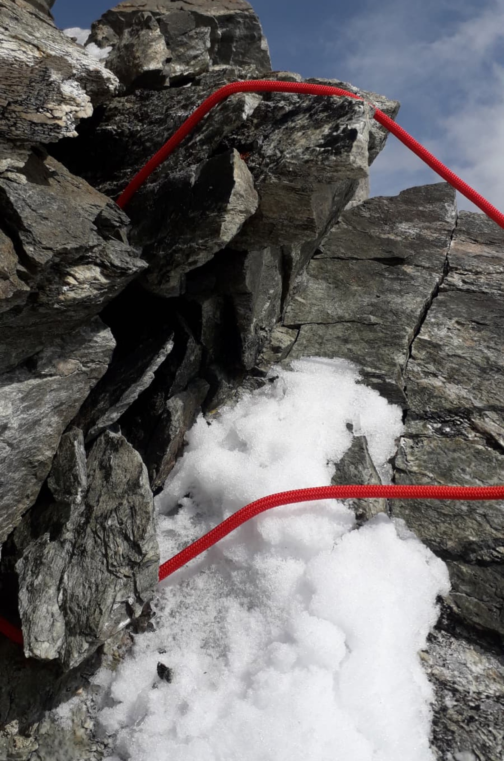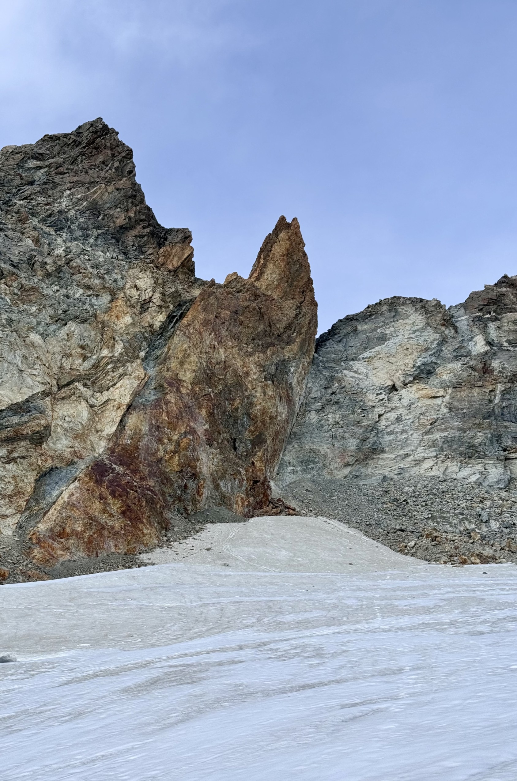 11h39. Nous sommes au sommet du gendarme crochu de l’arête est (4 075 m). Devant nous, à l’ouest, la Corne d’Hérens (4 148 m) s’élance contre le ciel, strate après strate. Ce n’est pas une corne, mais une carnassière de gneiss prête à déchirer quiconque s’y hasarde. Au nord, la Dent Blanche. À l’est, l’arête du Lion du Cervin, noyée dans le brouillard. Je sors de ma rêverie minérale. Nos regards sondent des voies possibles — et impossibles. Mais Julien n’est pas bien, il est au bout. À seulement 98 m du sommet, un seul choix s’impose : battre en retraite. « On est clairement trop lents, on redescend. »