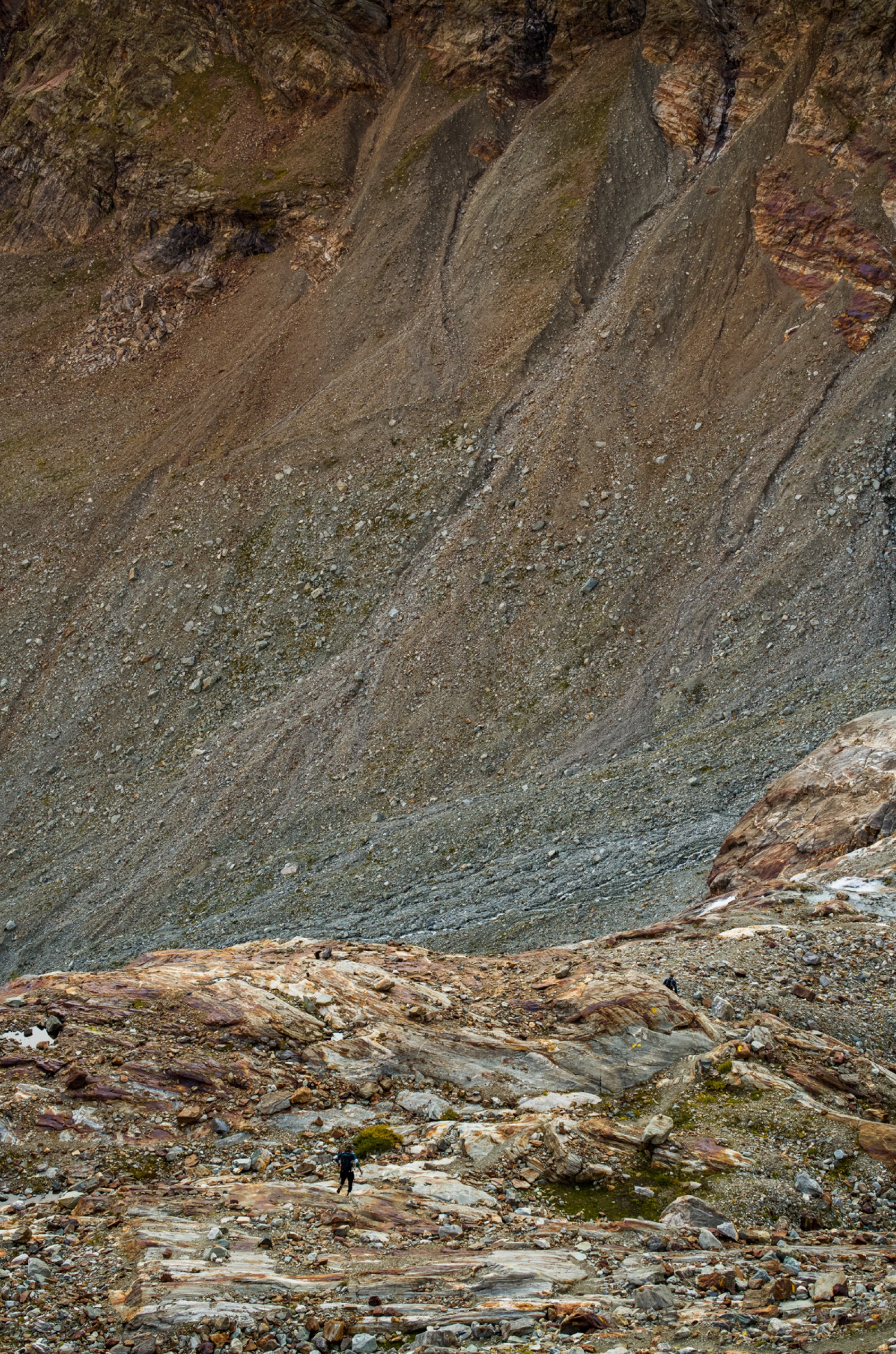 7h20. Le glacier des Grandes Murailles ressemble à un immense amphithéâtre structuré en trois gradins. Au pied du col de Tiefenmatten, nous sommes sur le premier, autour de l’isohypse 3 300 m. L’autre cordée, partie quarante minutes avant nous, vient d’atteindre le col. On se salue en agitant les bras comme des hélices, puis nous reprenons notre chemin sur le glacier, eux le leur sur la crête.