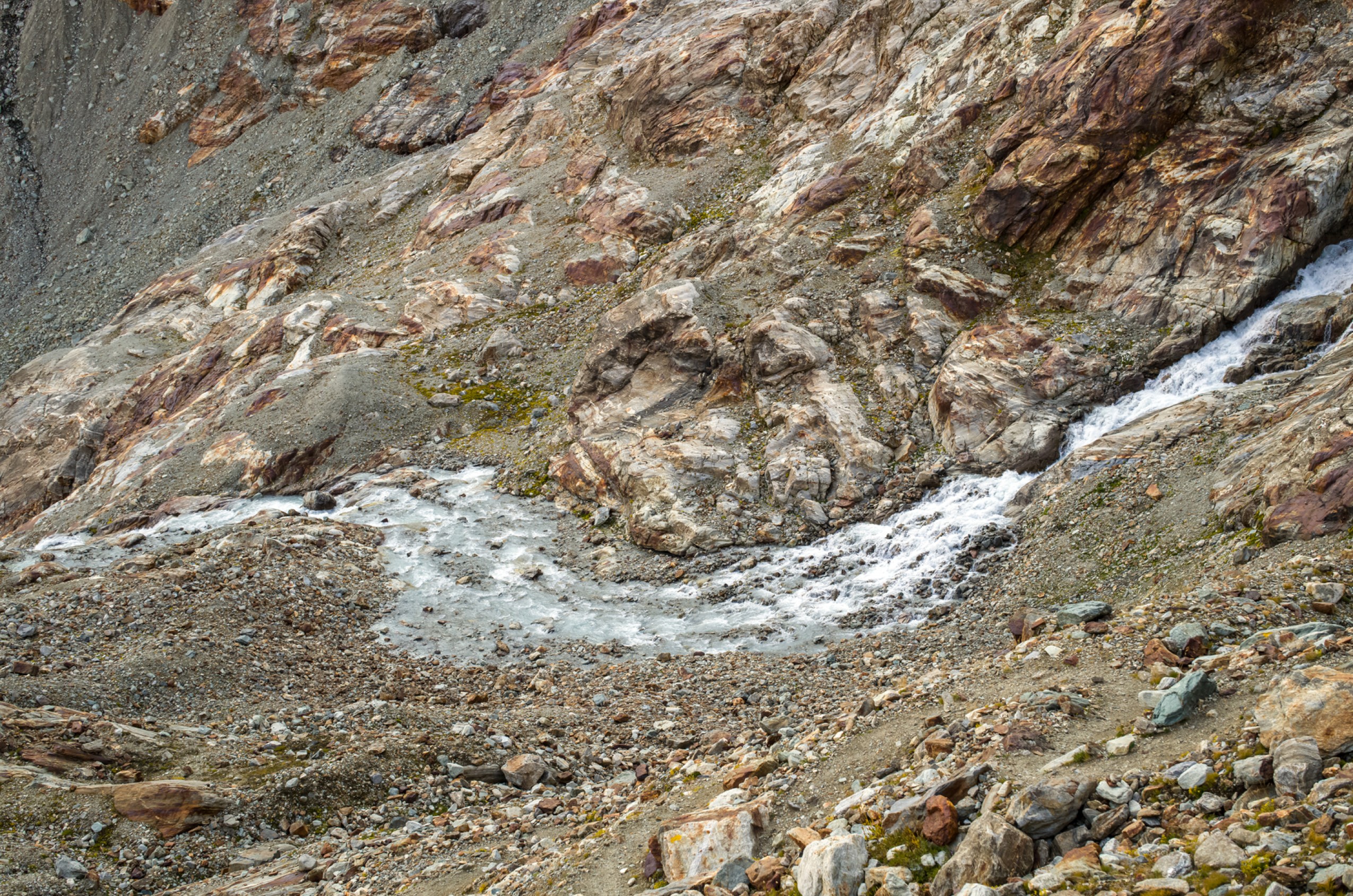 Le 11 septembre, nous chargeons les sacs. Quinze kilos de vivres et de matériel – plus d’un tiers de mon poids – qui se démultiplient à chaque pas. Nous longeons d’abord le lac de Places Moulin (5 km) jusqu’au hameau Prarayer, puis le torrent de Buthier de Valpelline (6 km), et enfin les dalles polies du glacier bas de Tsa de Tsan. Le refuge Aosta (2 788 m) est déjà fermé, mais la partie d’hiver est ouverte, ce qui nous évite d’emporter les sacs de couchage. Une autre cordée arrive un peu après nous, une alpiniste japonaise accompagnée de son guide suisse. Les edelweiss poussent comme des chardons autour du refuge. Je trouve ça beau. Le soir, nous préparons nos soupes, risottos et purées avec l’eau du torrent. Dîner copieux, nuit tranquille, pas de ronfleurs. La météo nous incite à tenter le sommet dès le lendemain, sans attendre.