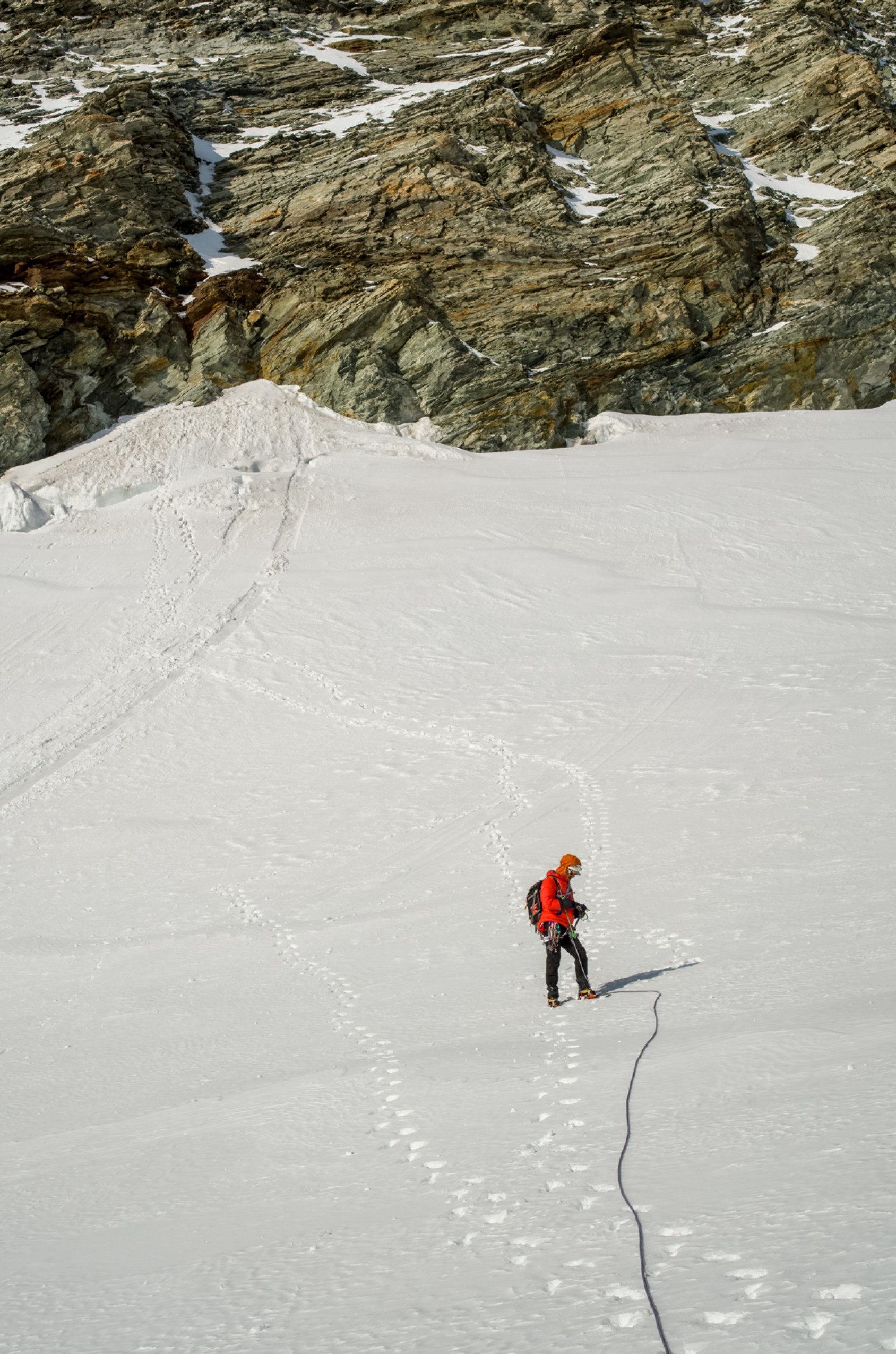 Le cœur se serre devant le renoncement, mais c’est la descente qui m’oppresse vraiment : la face sud-est de la Dent d’Hérens, monde inconnu et hostile.