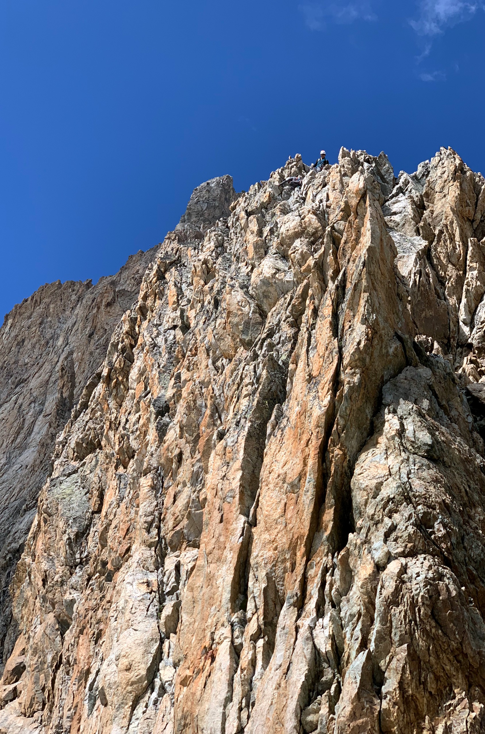 Eau, nourriture et selfies, la routine du sommet. Joie modérée, car je vois mieux ce que Mathieu veut dire par « au sommet, c’est loin d’être fini ». Trois rappels sont nécessaires pour descendre du Grand Pic sur la Brèche Zsigmondy. Lentement, très lentement, je me laisse glisser sur ce brin de corde qui me livre au vide. En plein jour, le vide est omnipotent. Si seulement il pouvait faire encore nuit, juste le temps des rappels !