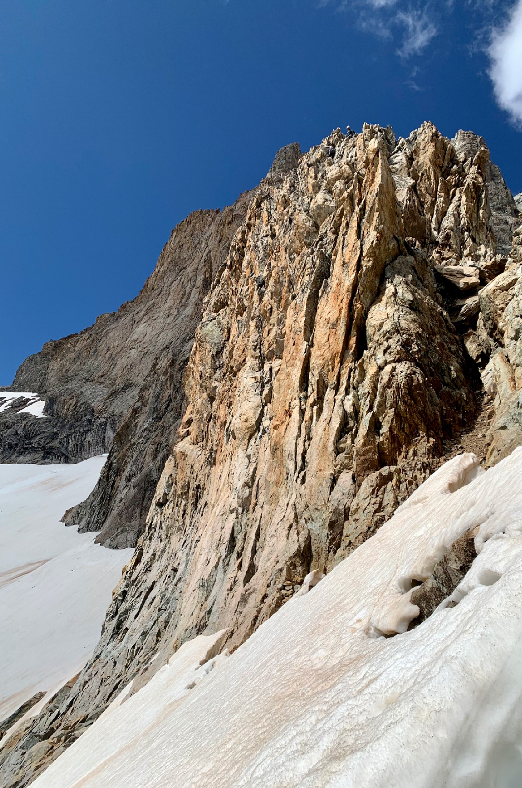 Prochaine épreuve : le Mur Castelnau, la plus dure partie de l’ascension, selon les avertissements de Mathieu. Cette immense dalle verticale sera l’occasion de me servir de toutes les ruses apprises à Fontainebleau, sans droit à l’erreur. Un pas après l’autre, c’est moins dur que ça a l’air. Au fil de l’ascension, d’autres personnages mythiques nous donnent des gages : l’Âne nous fait passer sur son Dos, les Autrichiens nous accordent la faveur de traverser leur Dalle. Le Chat fait un Pas vers nous et nous avise à préparer les crampons pour la rencontre avec le Glacier Carré. Suspendu aux parois de granite à 45º, ce glacier chenu et rabougri nous emmène gentiment jusqu’à la base du Grand Pic. Il nous reste encore 333 m précis de dénivelé jusqu’en haut. Rien du tout. Je me vois déjà au sommet.