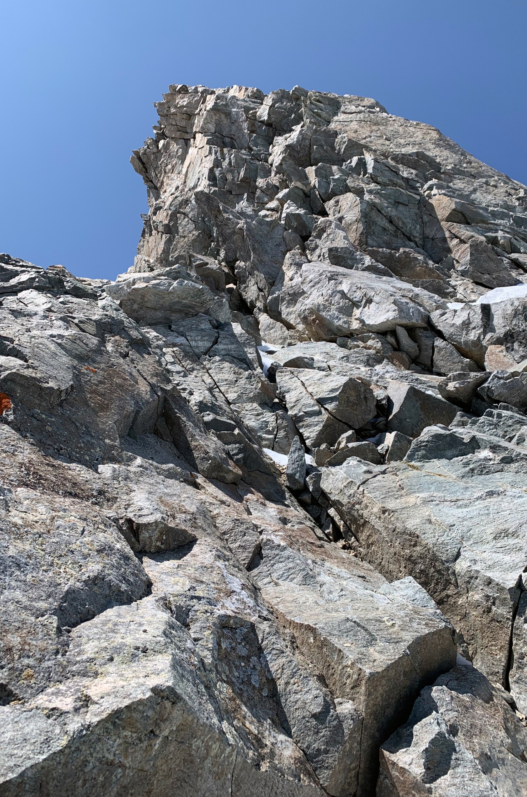 Mathieu me descend en moulinette dans une autre brèche, celle qui précède le Doigt de Dieu. Appelé aussi le Pic Central de la Meije, ce sommet sera les derniers mètres de dénivelé positif de notre traversée — je pourrais presque m’en passer, mais il n’y a pas de voie alternative. Ici, à 3973 m, nouveau dilemme mystique : pourquoi l’appelle-t-on Doigt de Dieu, mise à part sa forme de relique surhumaine ? Son orientation de bas en haut et non de haut en bas est une vraie énigme. Cela veut dire que soit (1) il n’appartient pas à Dieu, céleste par nature, soit (2) Dieu même siège dans cette montagne, de façon animiste. Après 8h d’effort et un certain manque d’oxygène, je conclus que ce doigt doit appartenir à une déesse chthonienne, maîtresse du granite et du gneiss, en colère contre le cosmos pour ses foudres et inconstances. Appelons le « le Doigt de la Déesse », ça me paraît plus plausible.